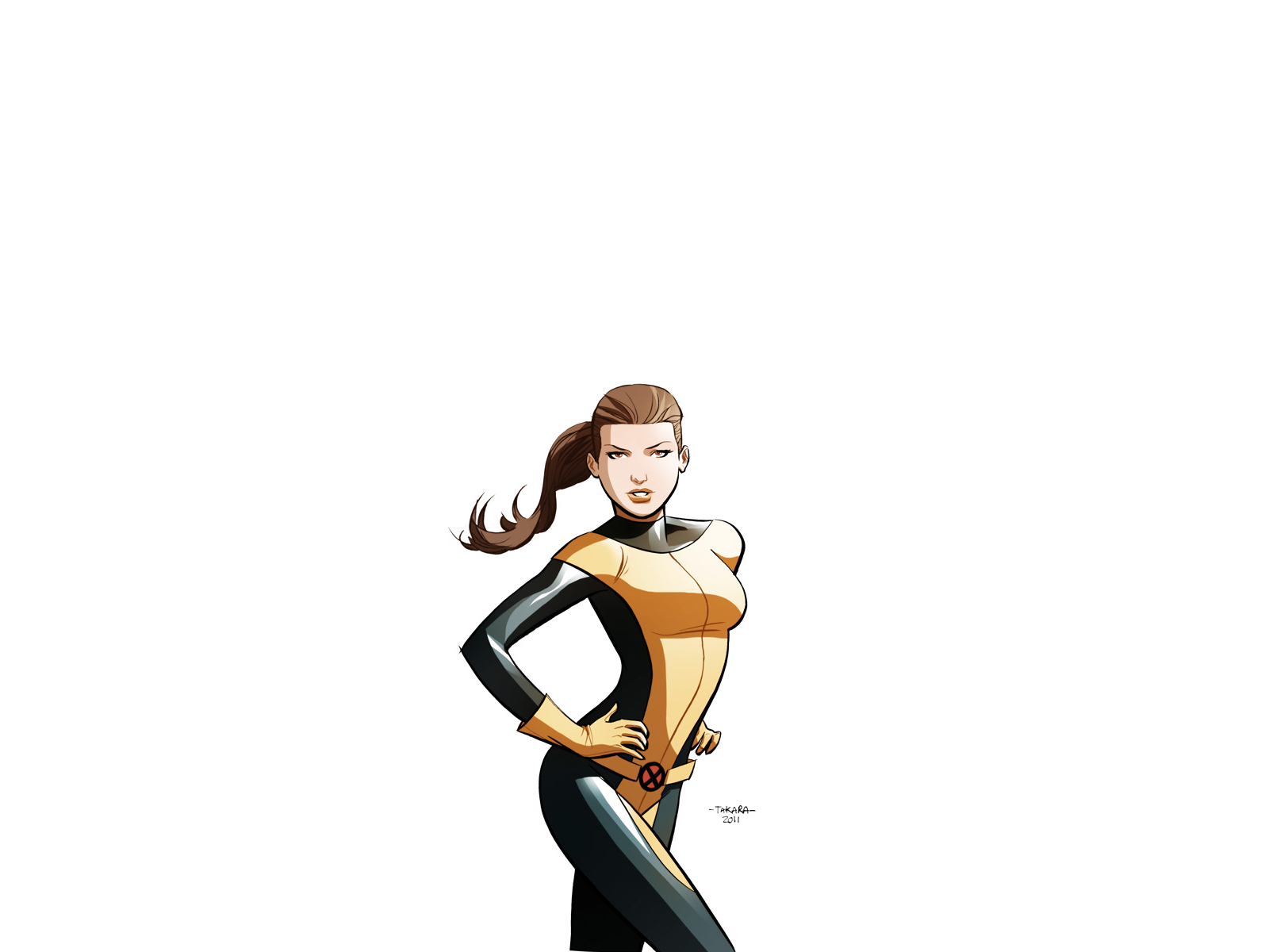 Description: A woman in a yellow and black suit with a sword in her hand and a white background with a white background.