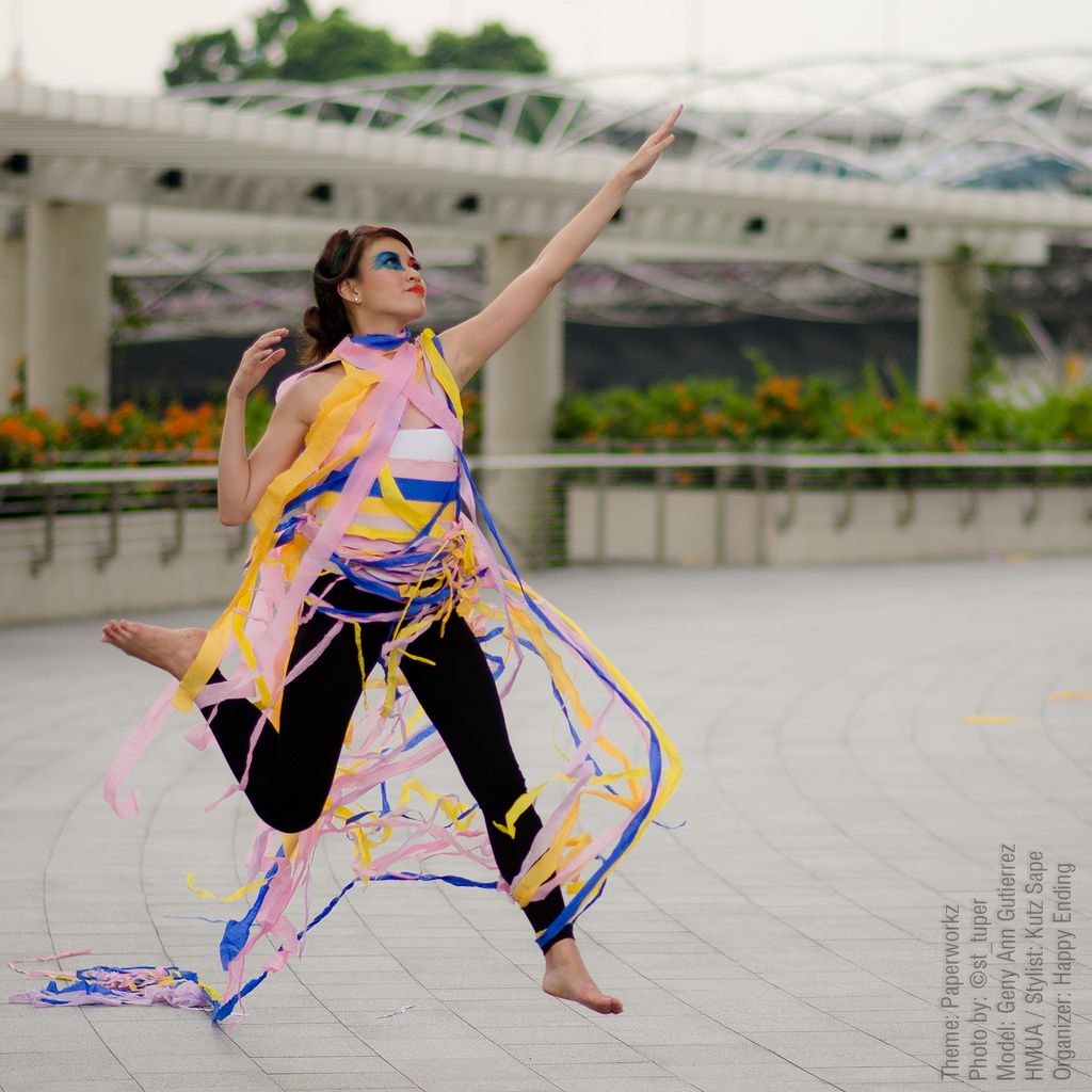Description: A woman in a yellow and blue dress is dancing with a kite in her hand and a white ball in her hand.
