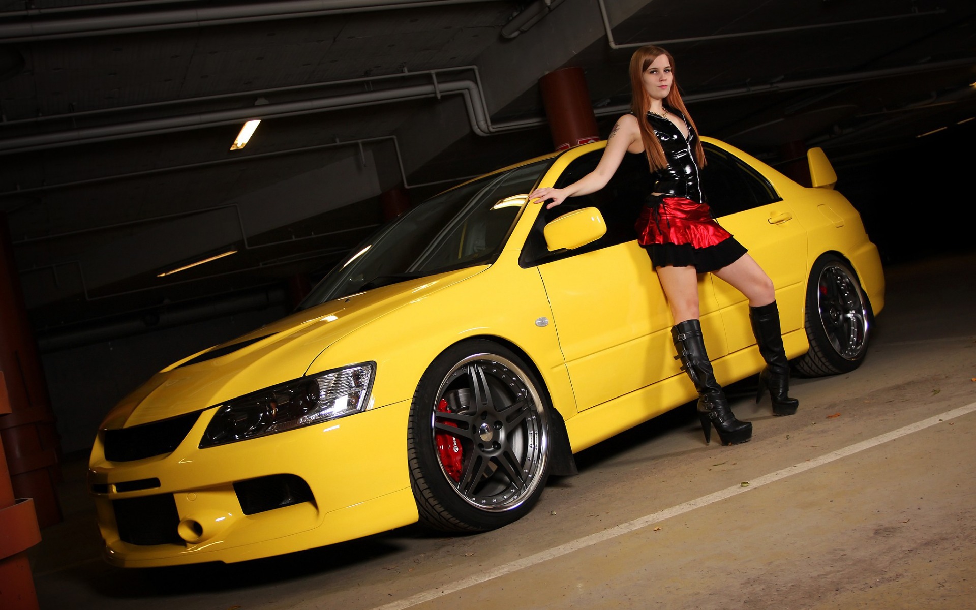 Description: A woman in a short skirt leaning on a yellow car in a parking garage with her hand on the door.
