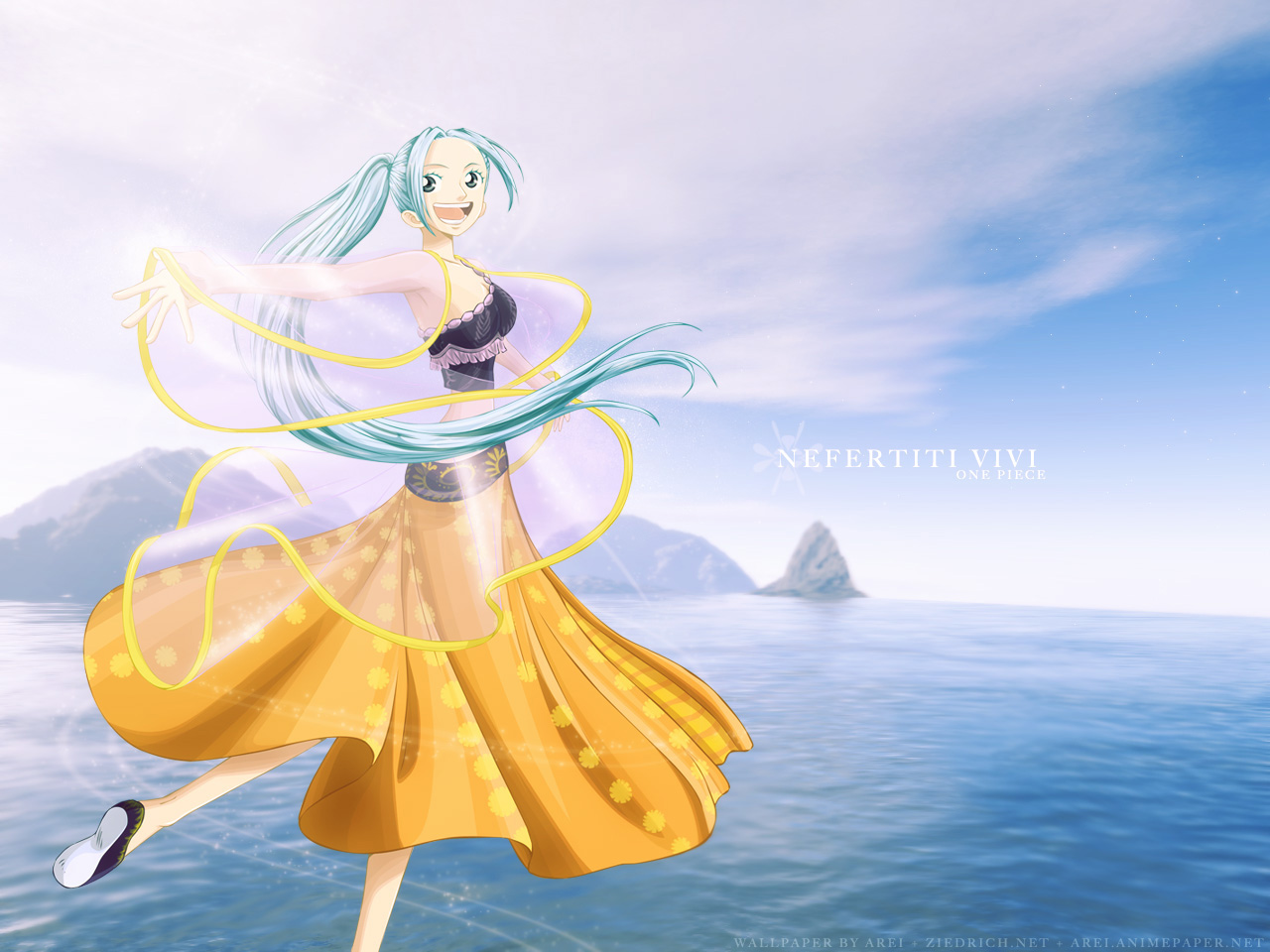 Description: A woman in a yellow dress is flying over the water with a mountain in the background and a blue sky.