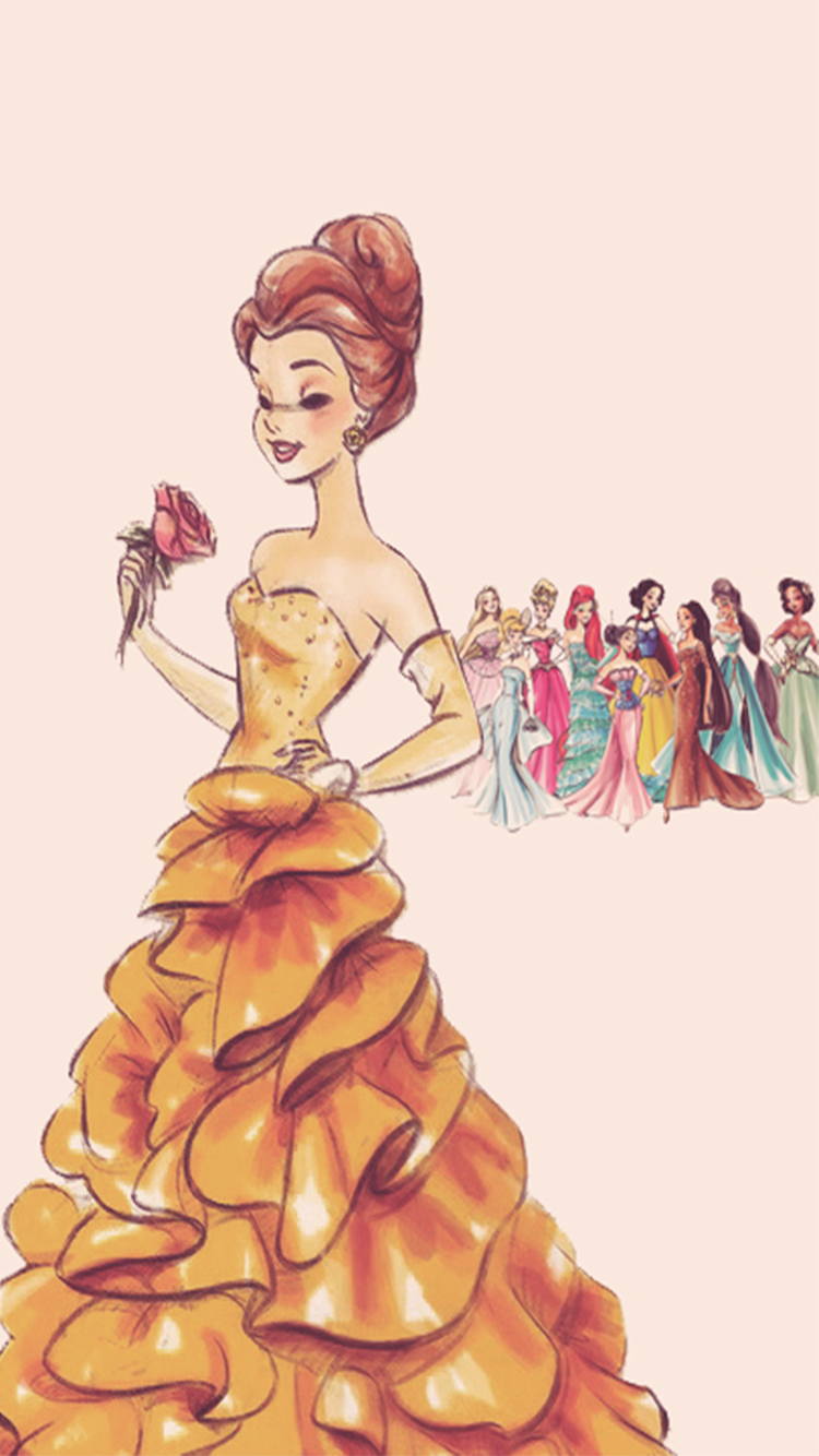 Description: A drawing of a woman in a yellow dress holding a rose in her hand and a group of people in the background.