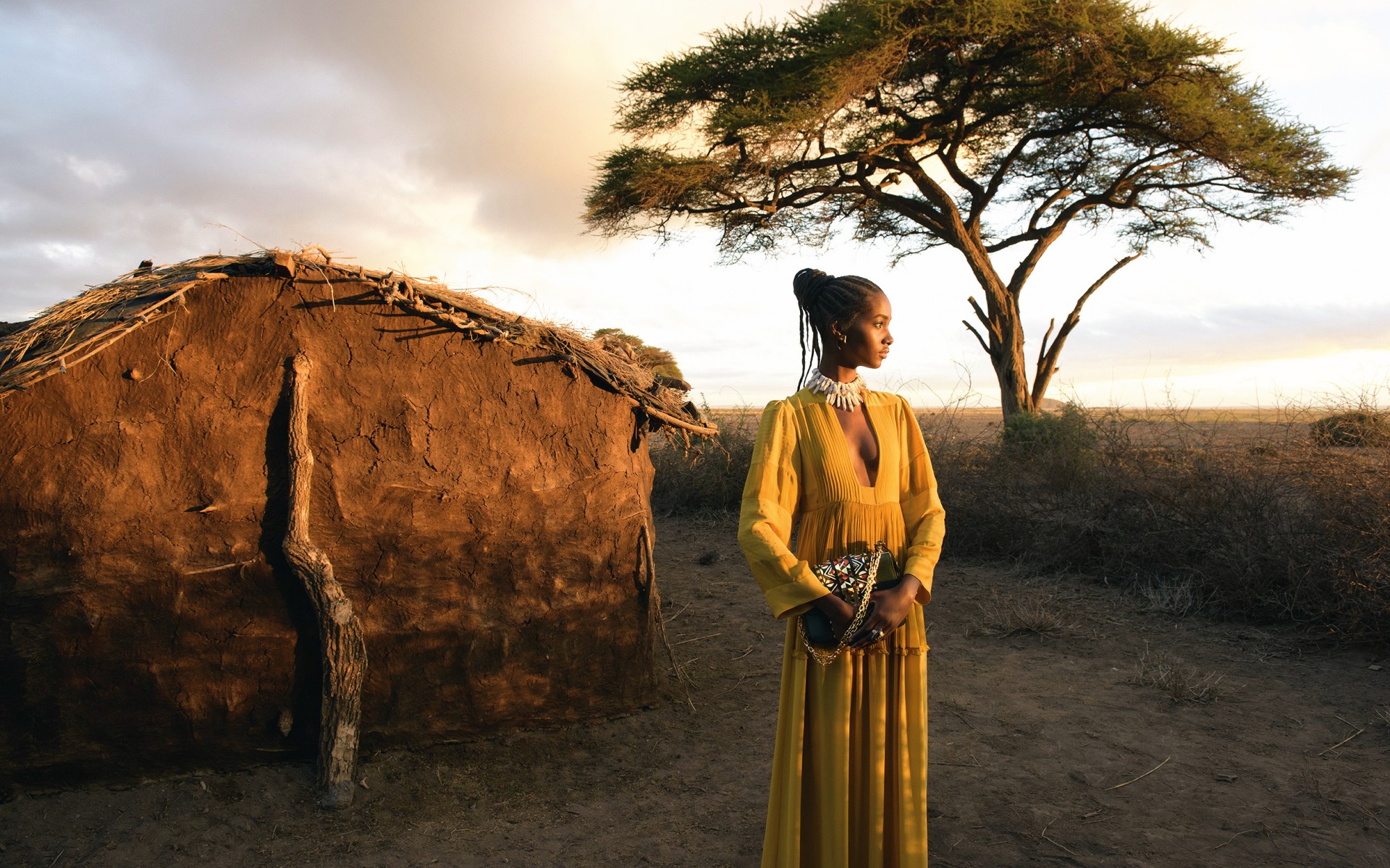Description: A woman in a yellow dress standing in front of a hut with a tree in the background and a tree in the foreground.