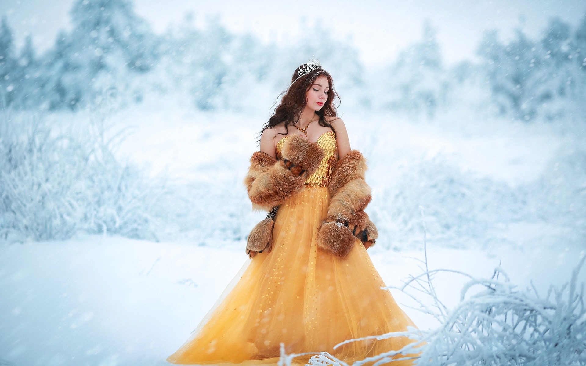 Description: A woman in a yellow dress holding a teddy bear in a snowy field with trees in the background and snow falling on her.