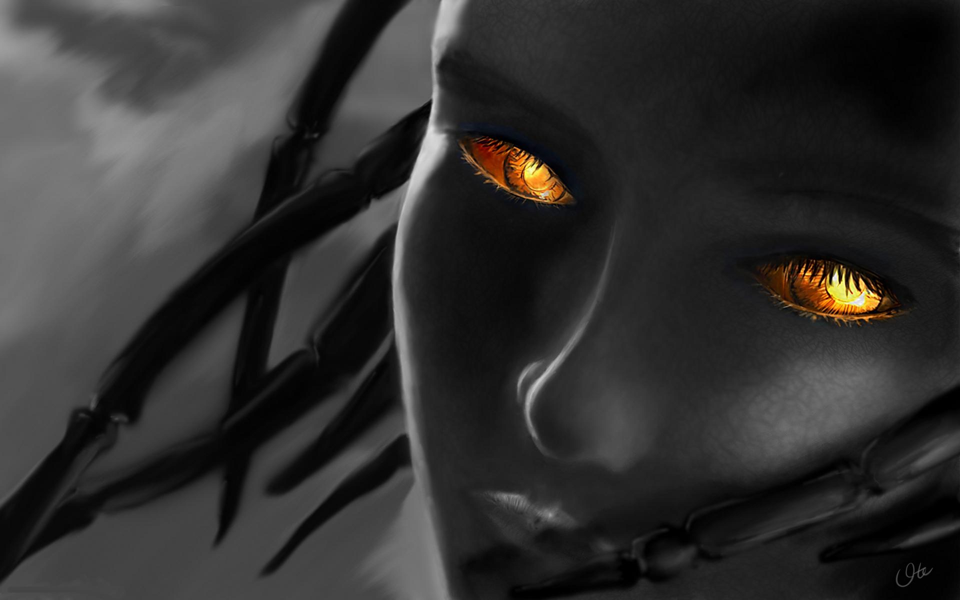 Description: A woman with yellow eyes and a black mask with spikes on her head and a barbed wire fence around her neck.
