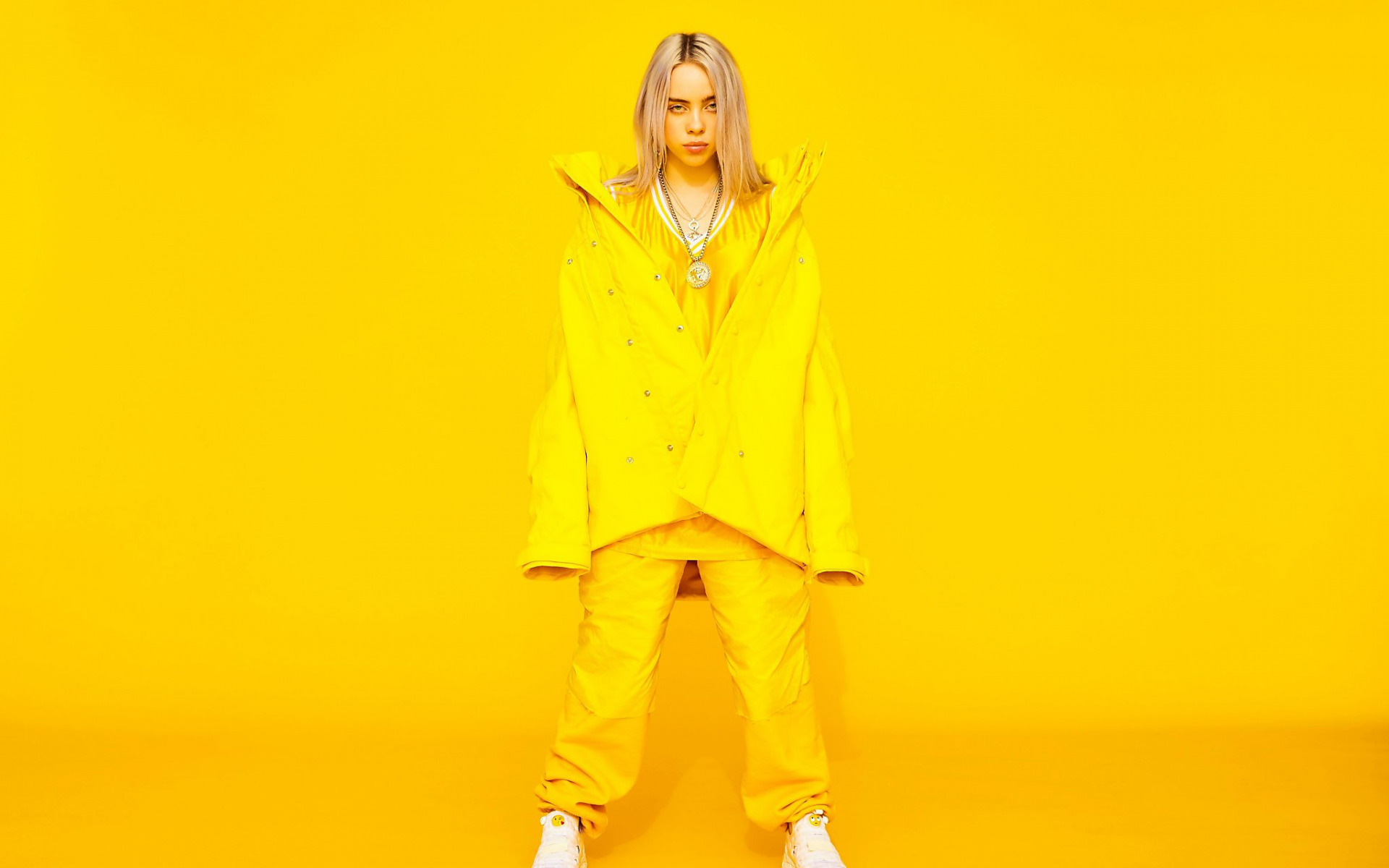 Description: A woman in yellow is standing on a yellow background with her arms outstretched and her head tilted back.