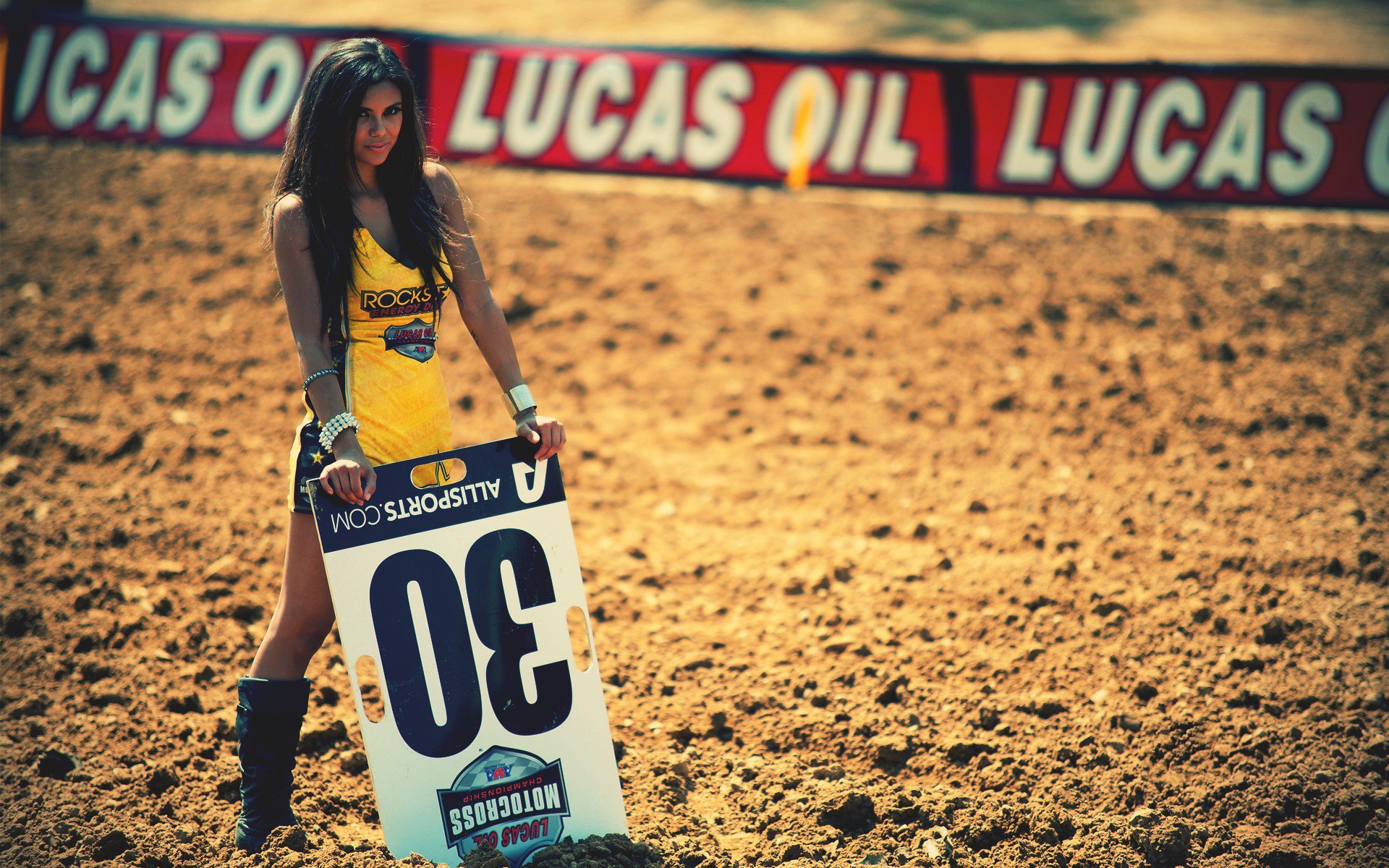 Description: A woman in a yellow shirt holding a sign in a dirt field with a banner in the background that says lucas oil lucas.