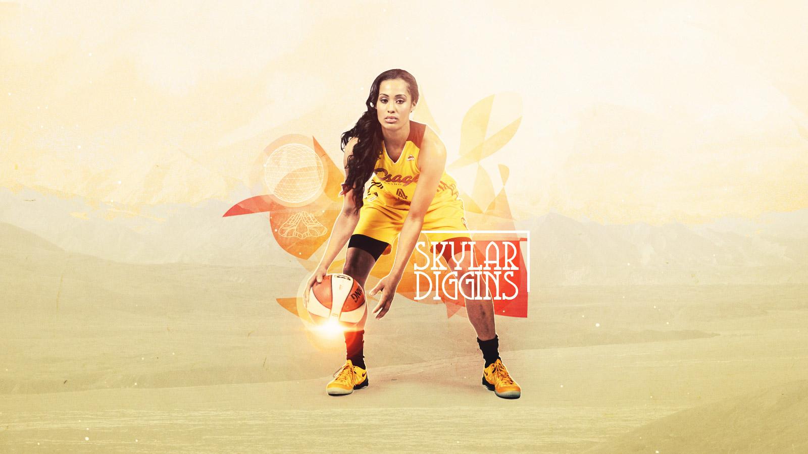 Description: A woman in a yellow uniform holding a basketball ball and a sign that says sugar begins on it with a background of mountains.