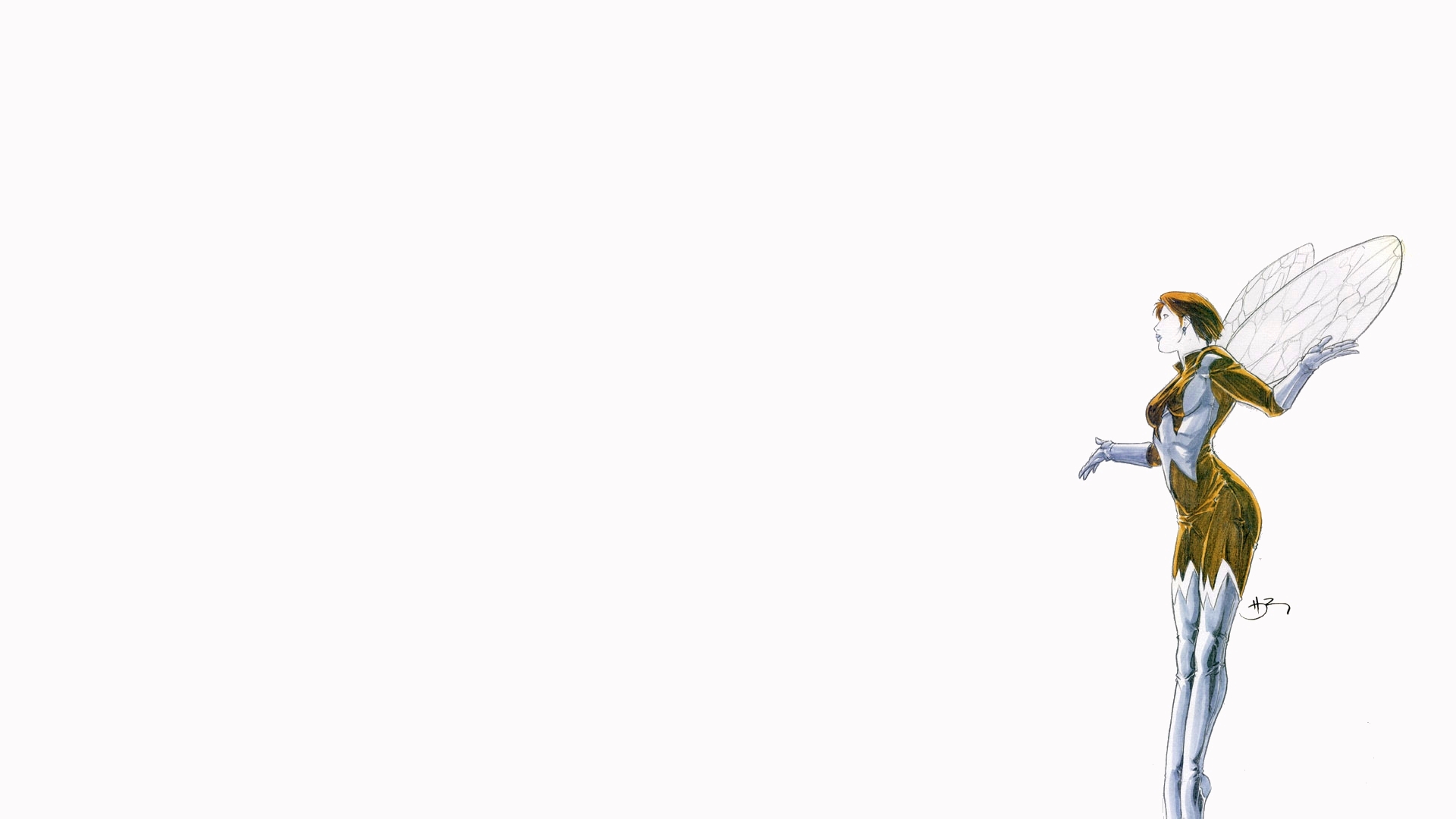 Description: A woman dressed in a yellow and white costume with a butterfly on her back and wings outstretched.
