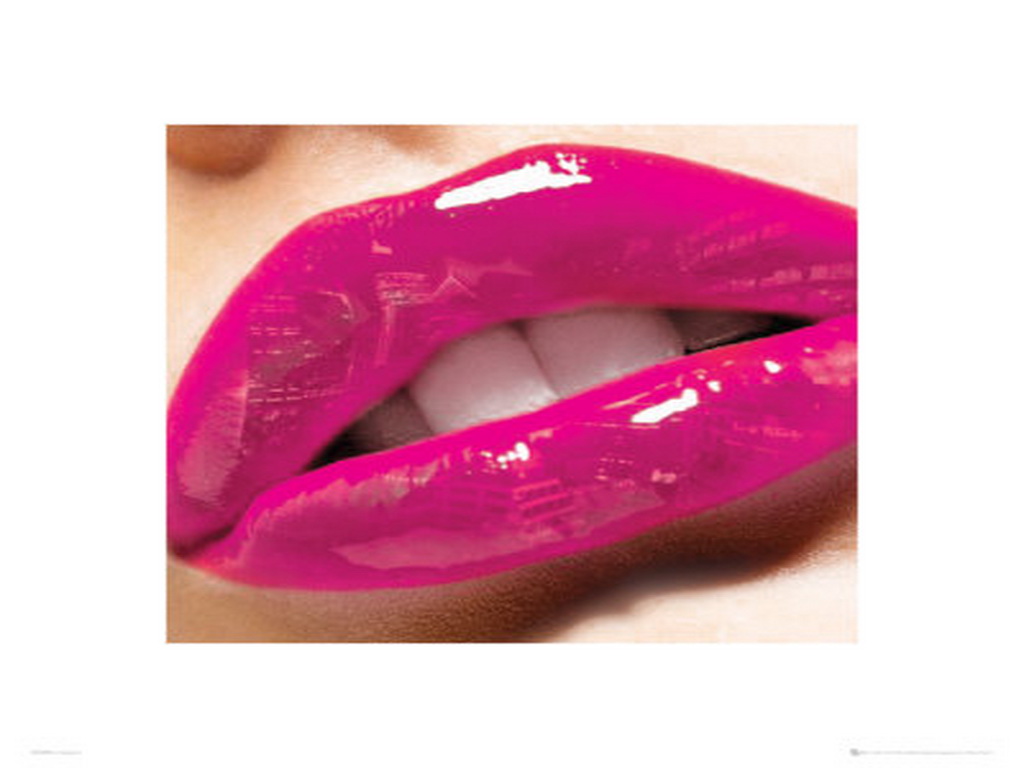Description: A woman's lips with bright pink lipstick on them and a white background with a white square frame.