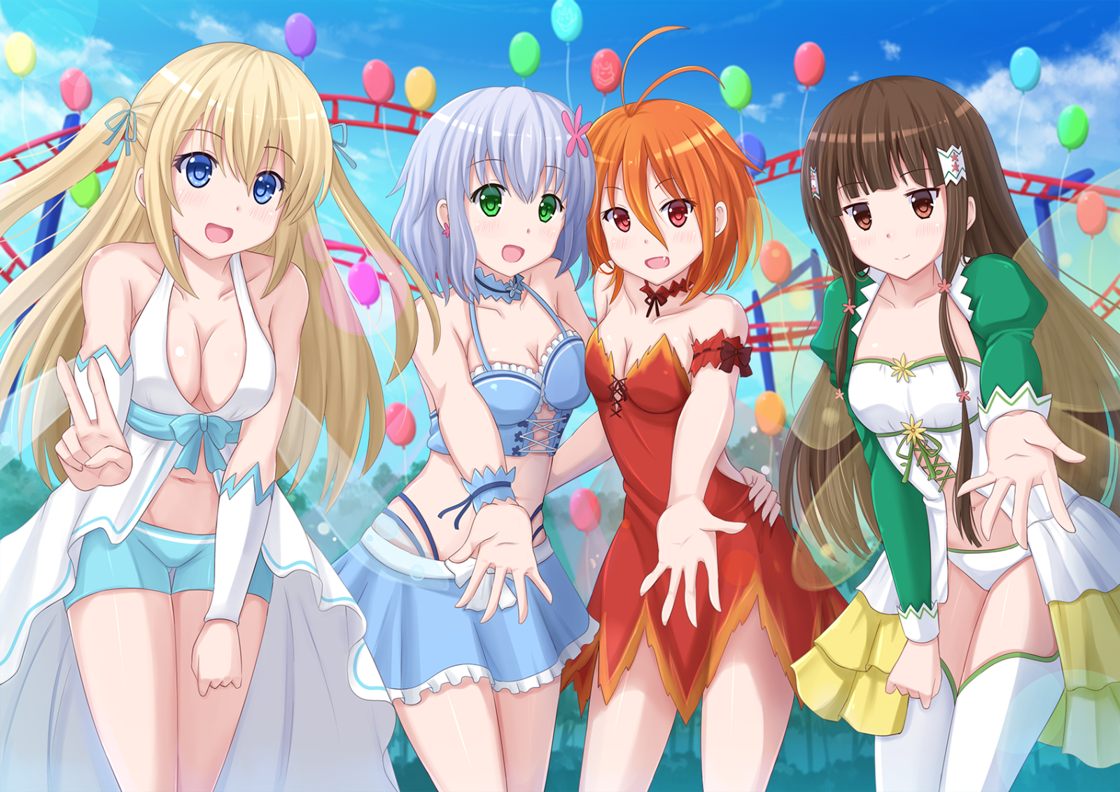 Description: A group of women in bathing suits standing next to each other in front of a carnival ride with balloons.
