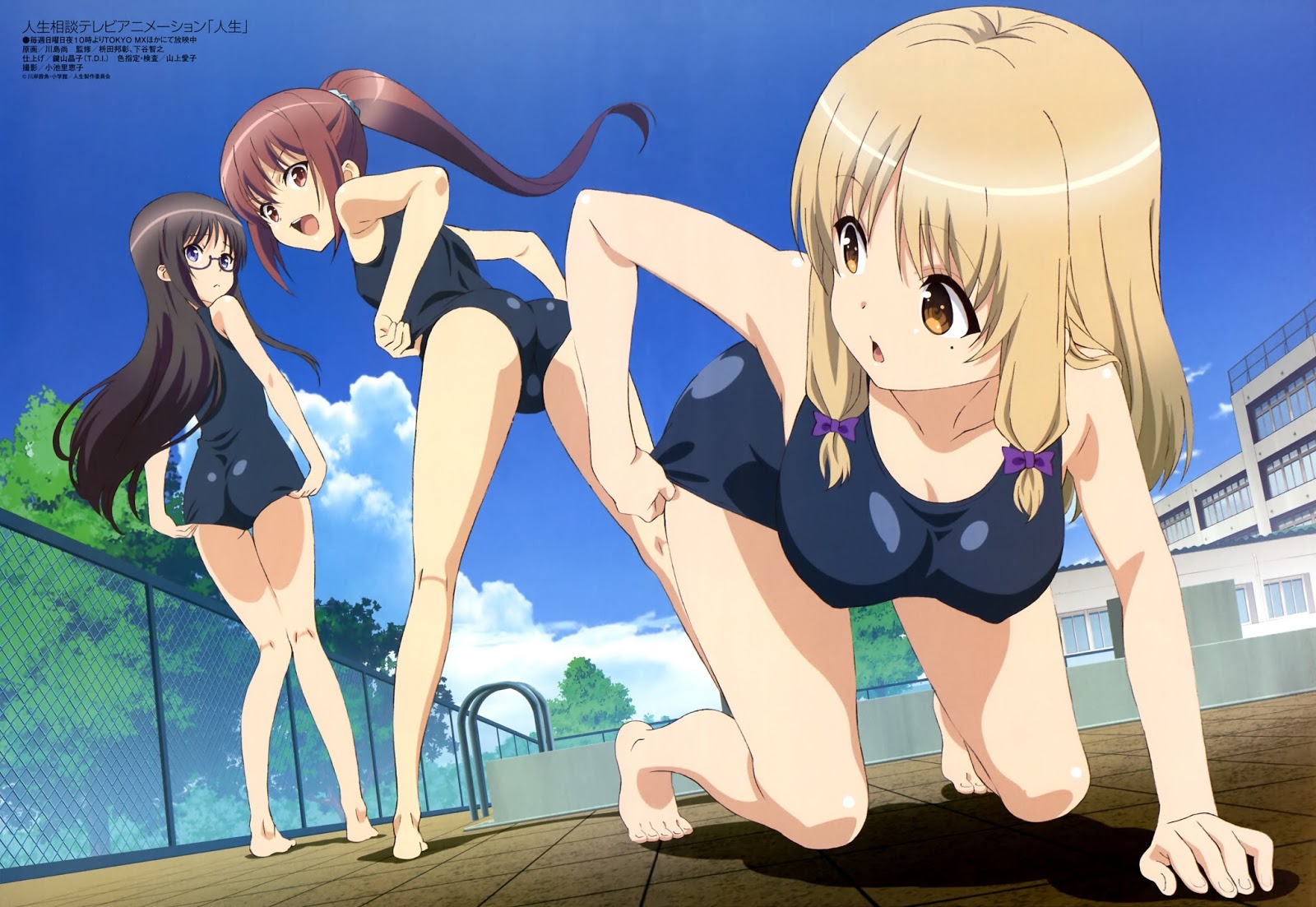 Description: A group of women in bathing suits standing on a swimming pool in front of a fenced in area.