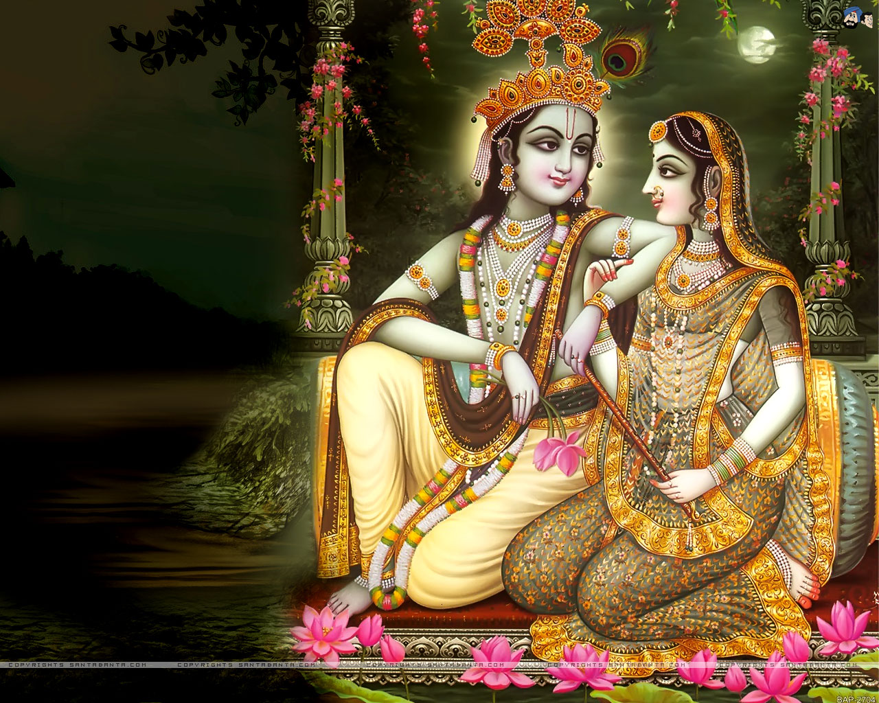 Description: A painting of two women sitting on a bench in front of a lake with flowers in the foreground.