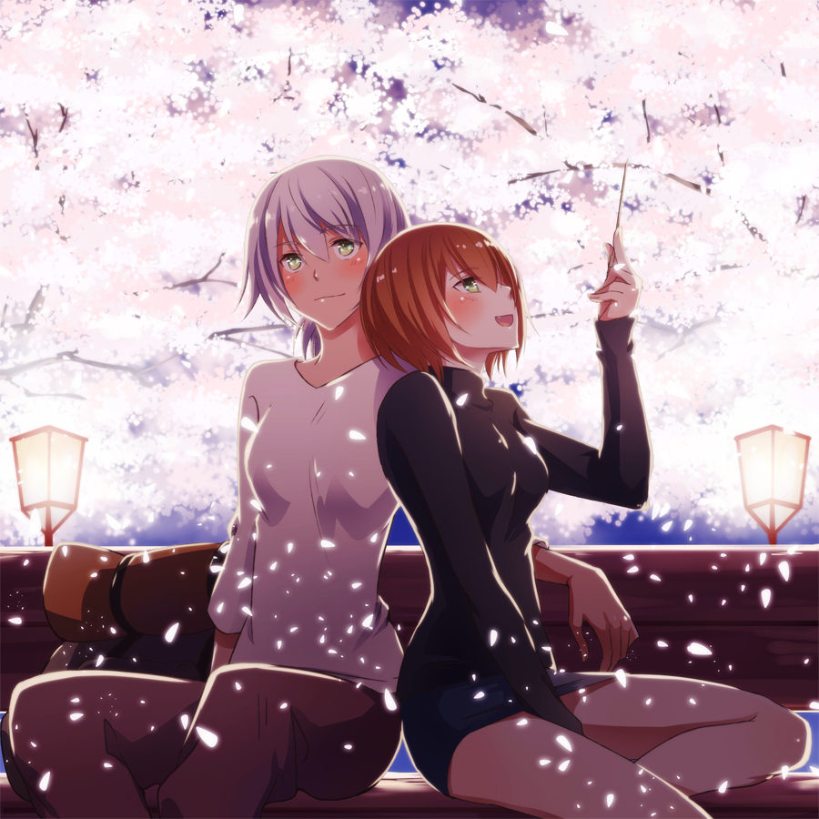 Description: Two women sitting on a bench in front of a tree with snow falling on it and a lamppost in the background.