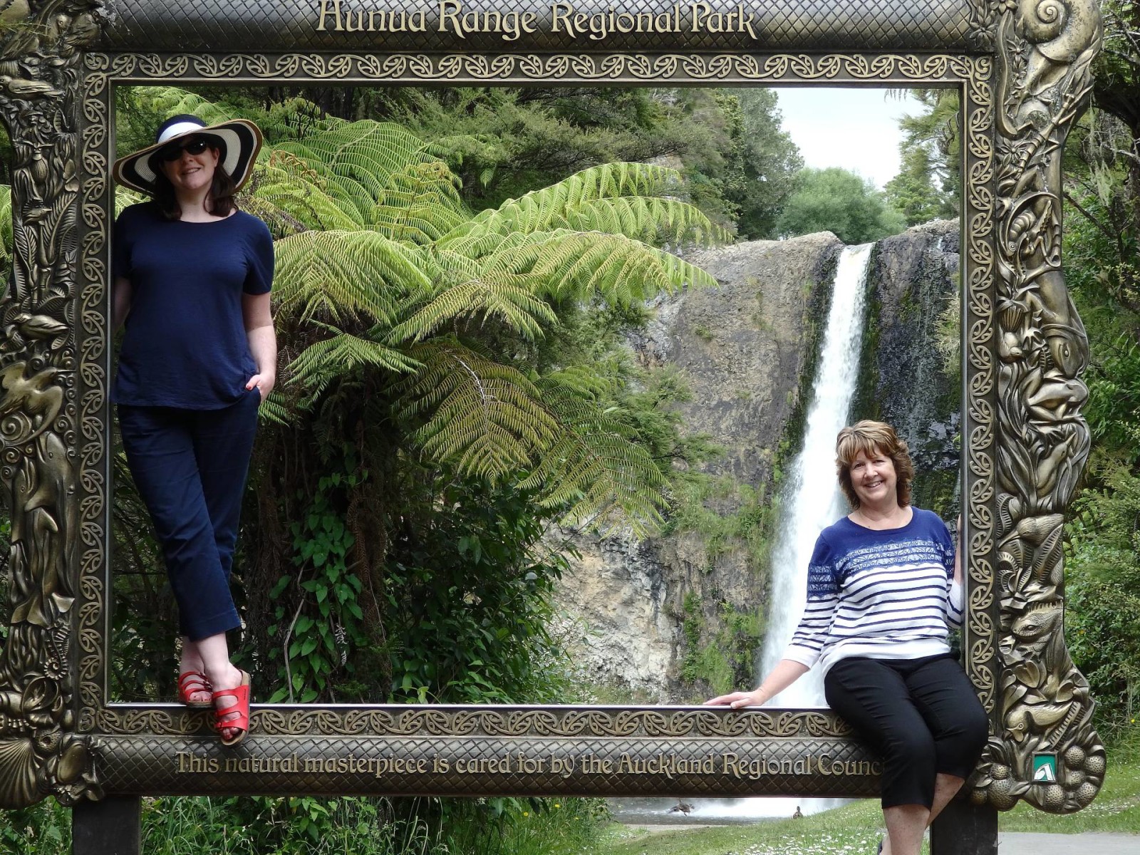 Description: Two women sitting on a bench in front of a picture frame with a waterfall in the background and a fern tree in the foreground.