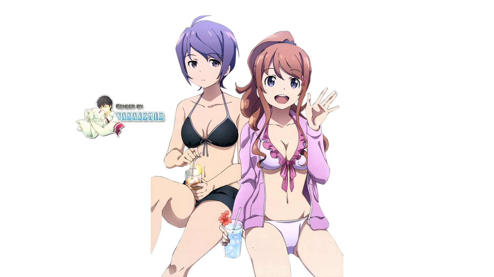 Description: Two women in bikinis sitting next to each other on a black background with a black background behind them.