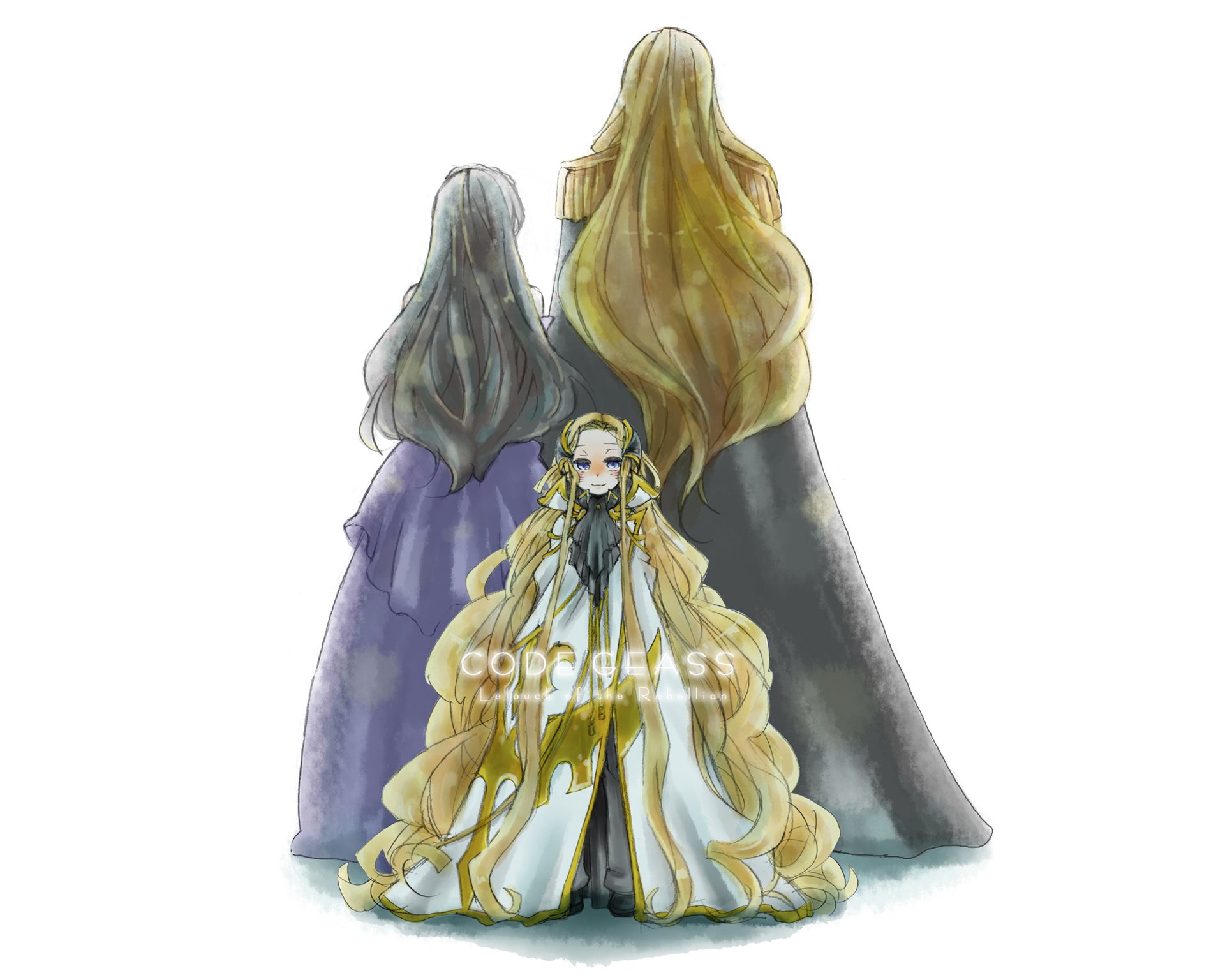 Description: A drawing of two women in dresses with long hair and a long dress with a long train on the bottom.