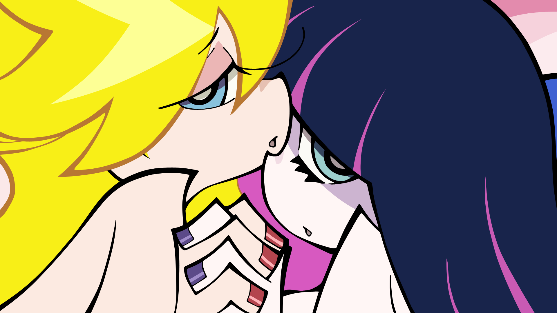 Description: A couple of women kissing each other with a yellow background and blue eyes and a pink and yellow background.