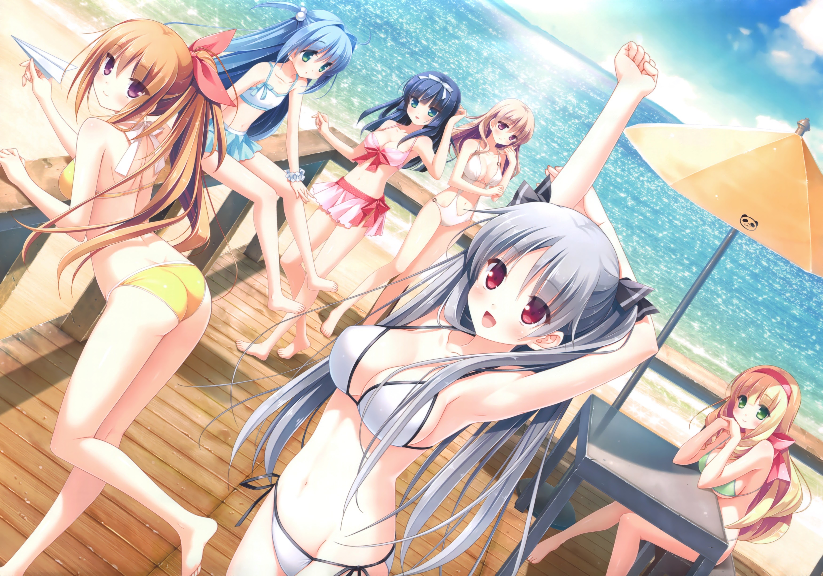 Description: A group of women standing on top of a wooden pier next to the ocean with an umbrella over them.