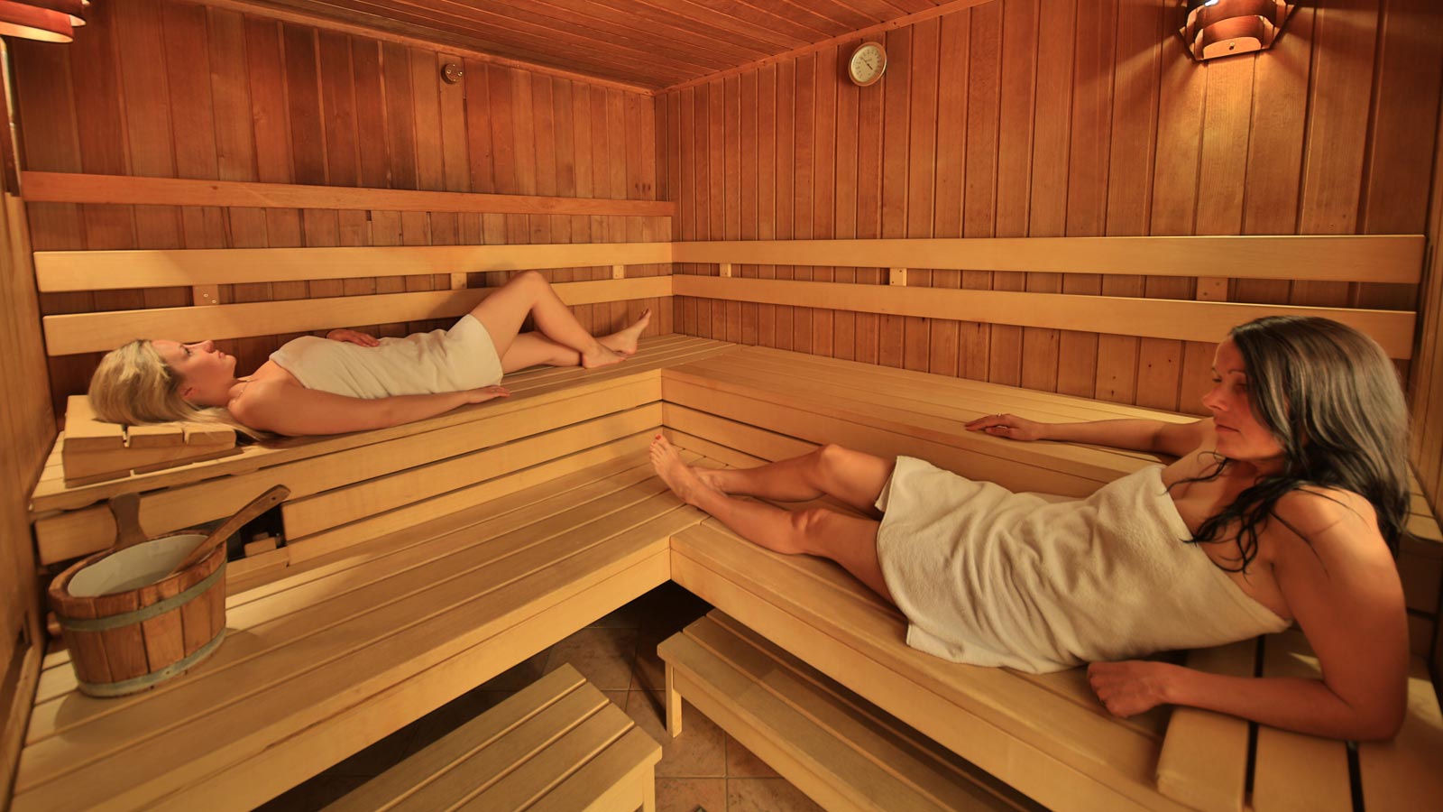 Description: Two women are relaxing in a sauna with a bucket of water on the side of the sauna.
