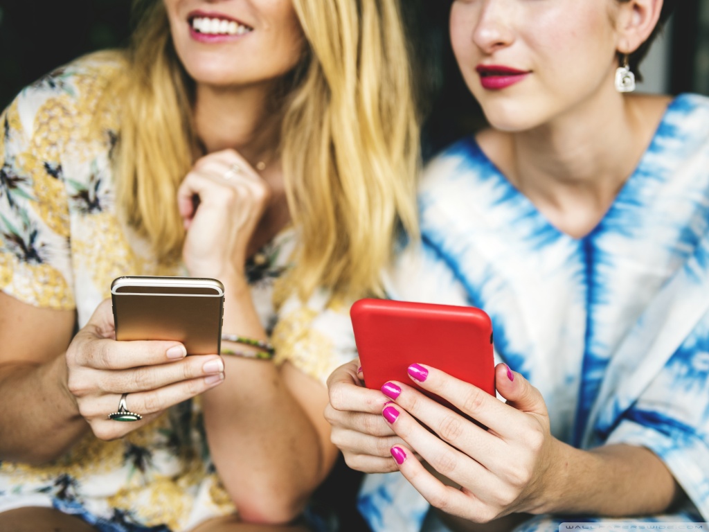 Description: Two women sitting next to each other looking at their cell phones together.