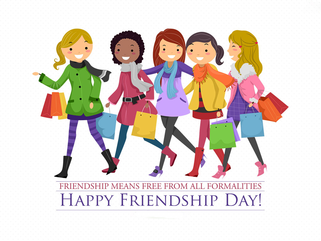 Description: A group of women walking down a street holding shopping bags and smiling at the camera with a message that reads.