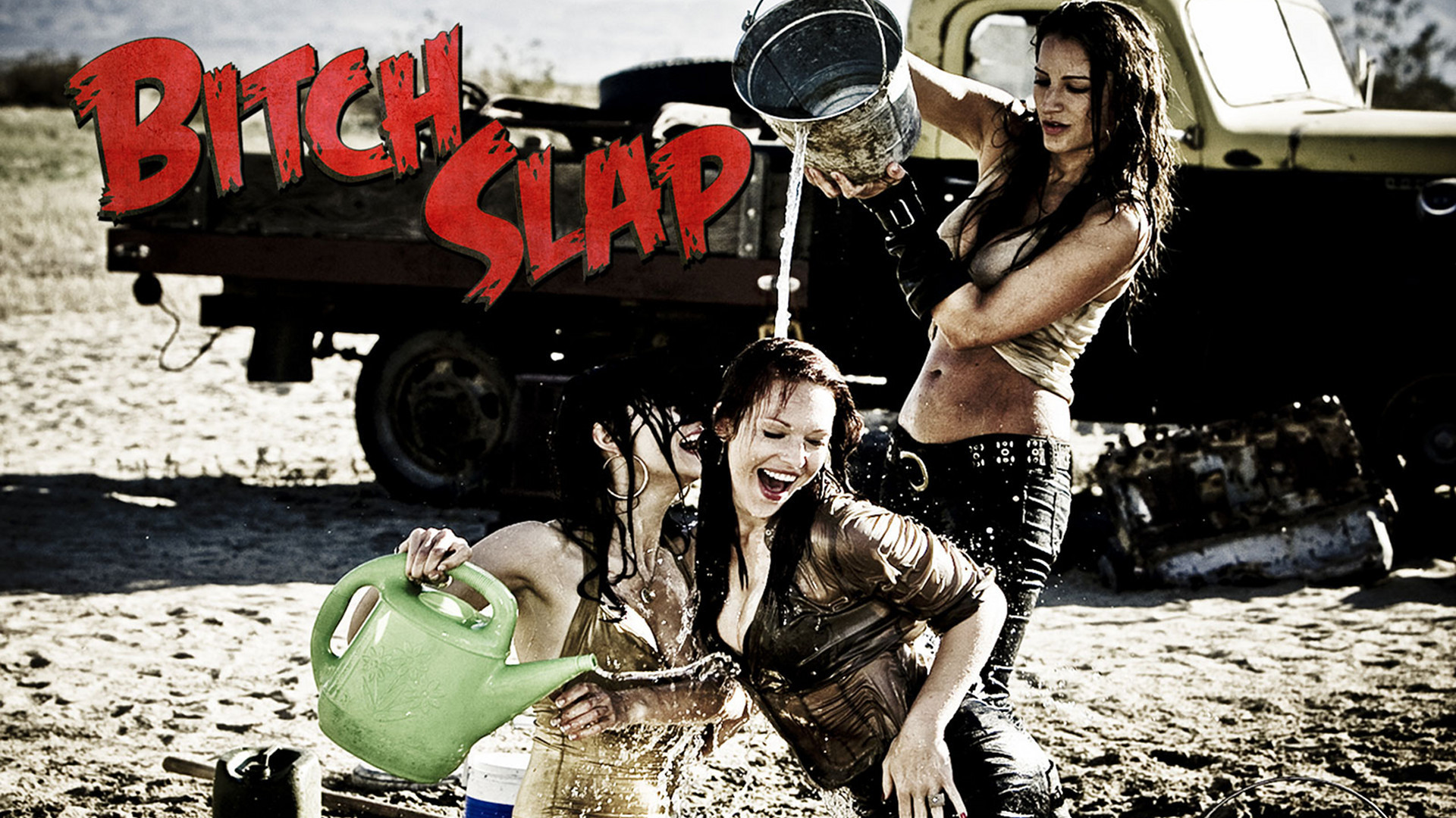 Description: Two women in wetsuits are pouring water on a truck and a truck is in the background with the words bitch slap.