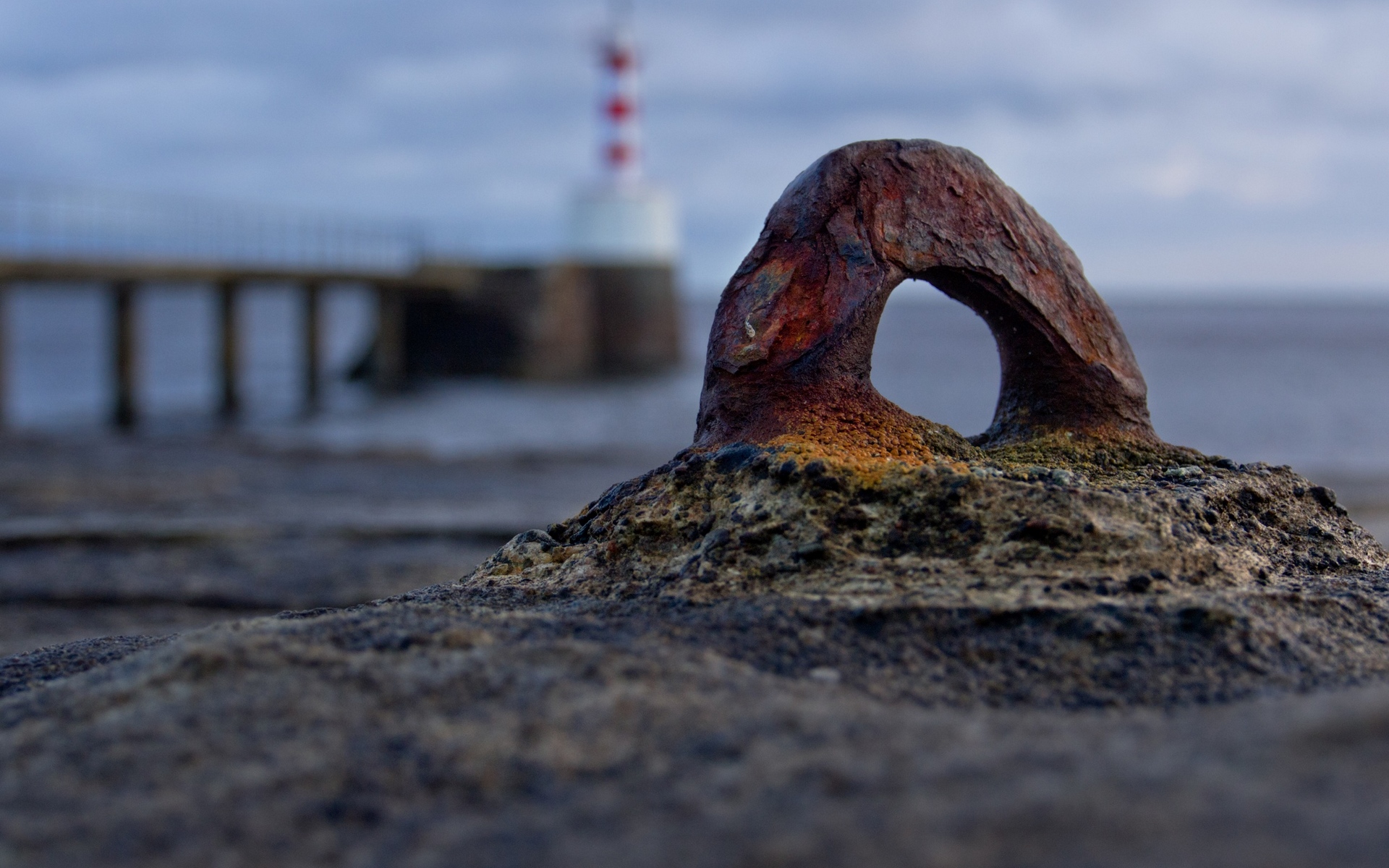 Description: A piece of wood that is sitting in the sand near the water and a lighthouse in the background with a cloudy sky.