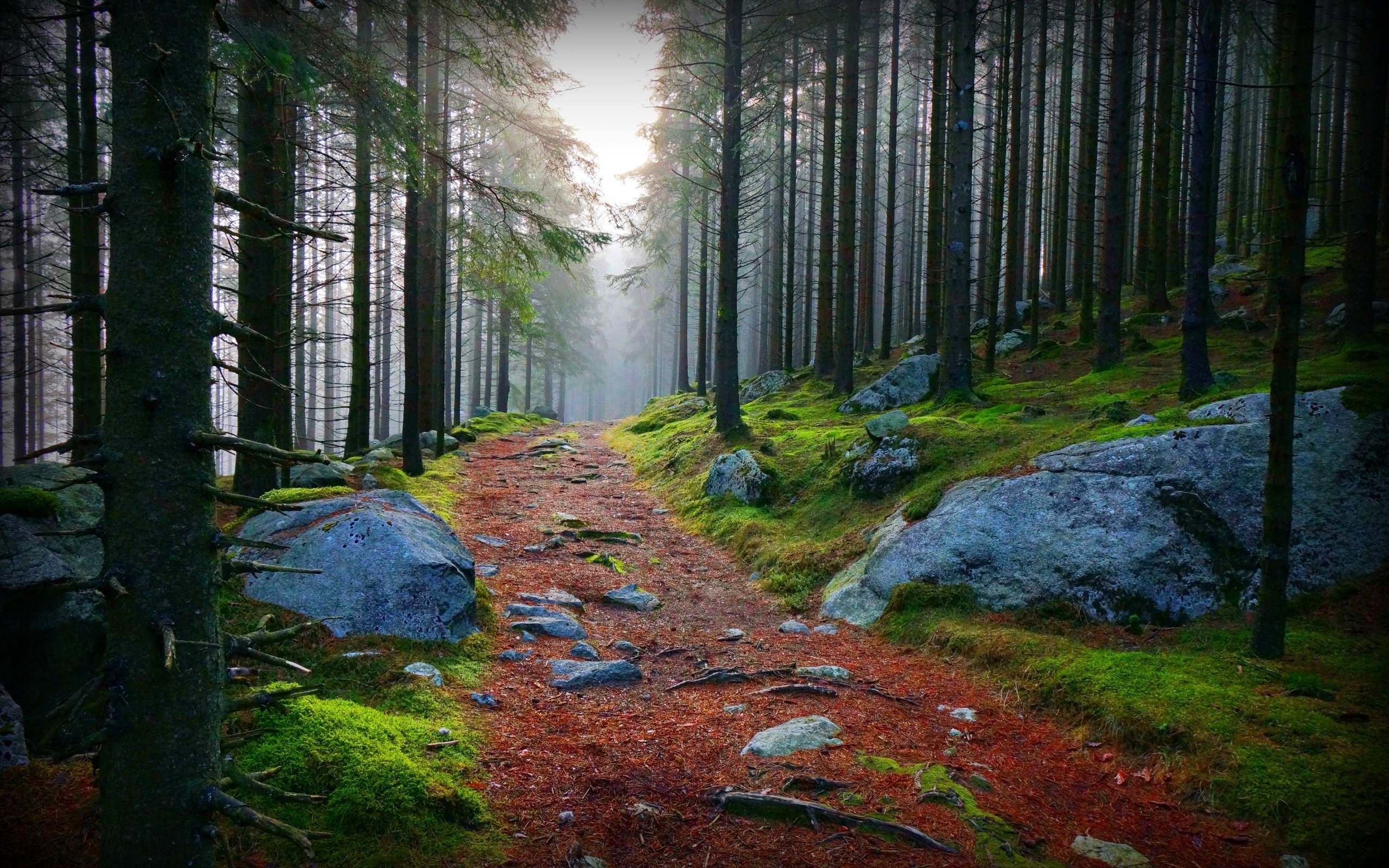 Description: A trail in the woods with rocks and trees on both sides of it and fog in the distance behind it.