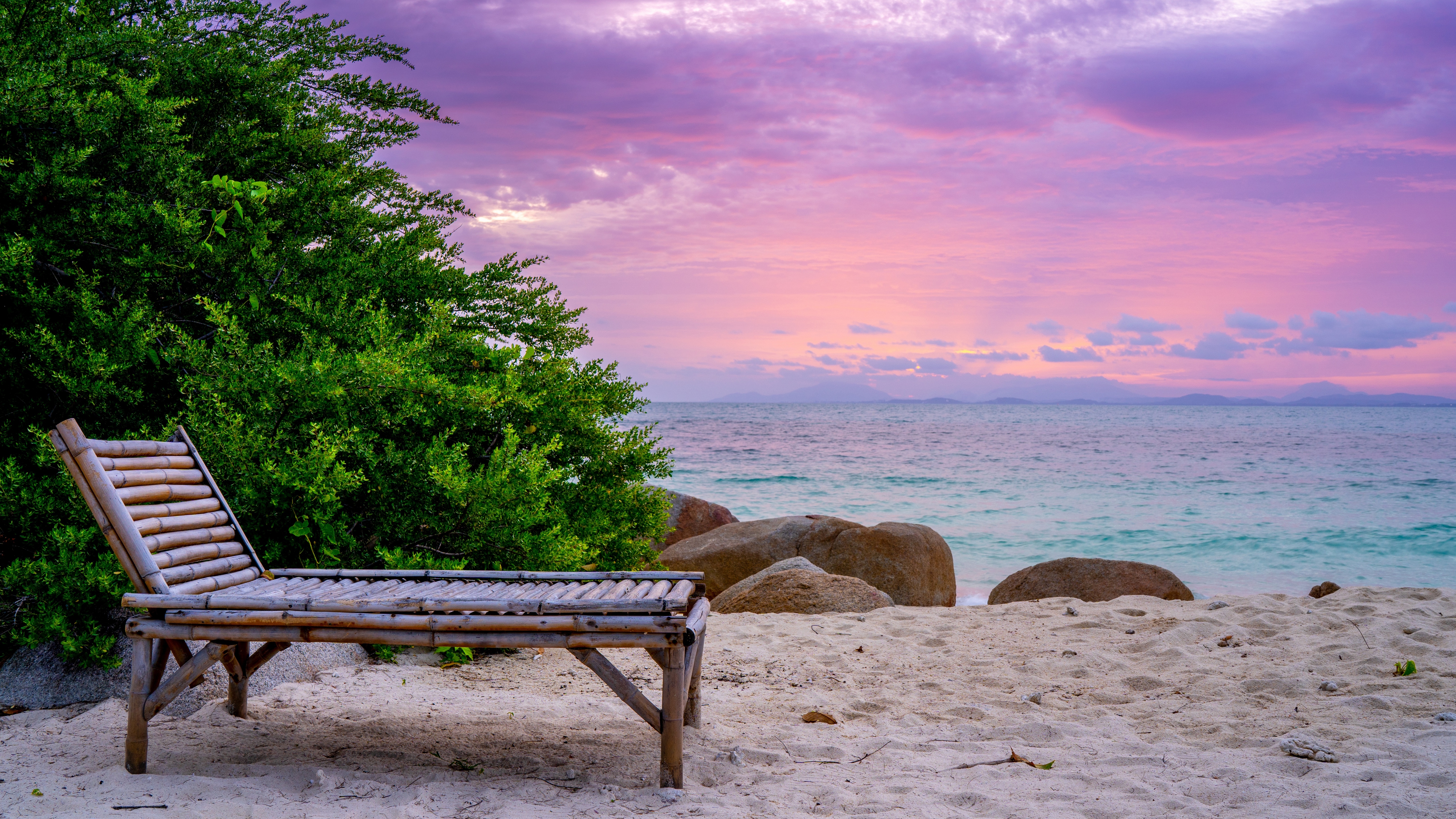 Description: A wooden bench sitting on top of a sandy beach next to the ocean at sunset with a pink sky.
