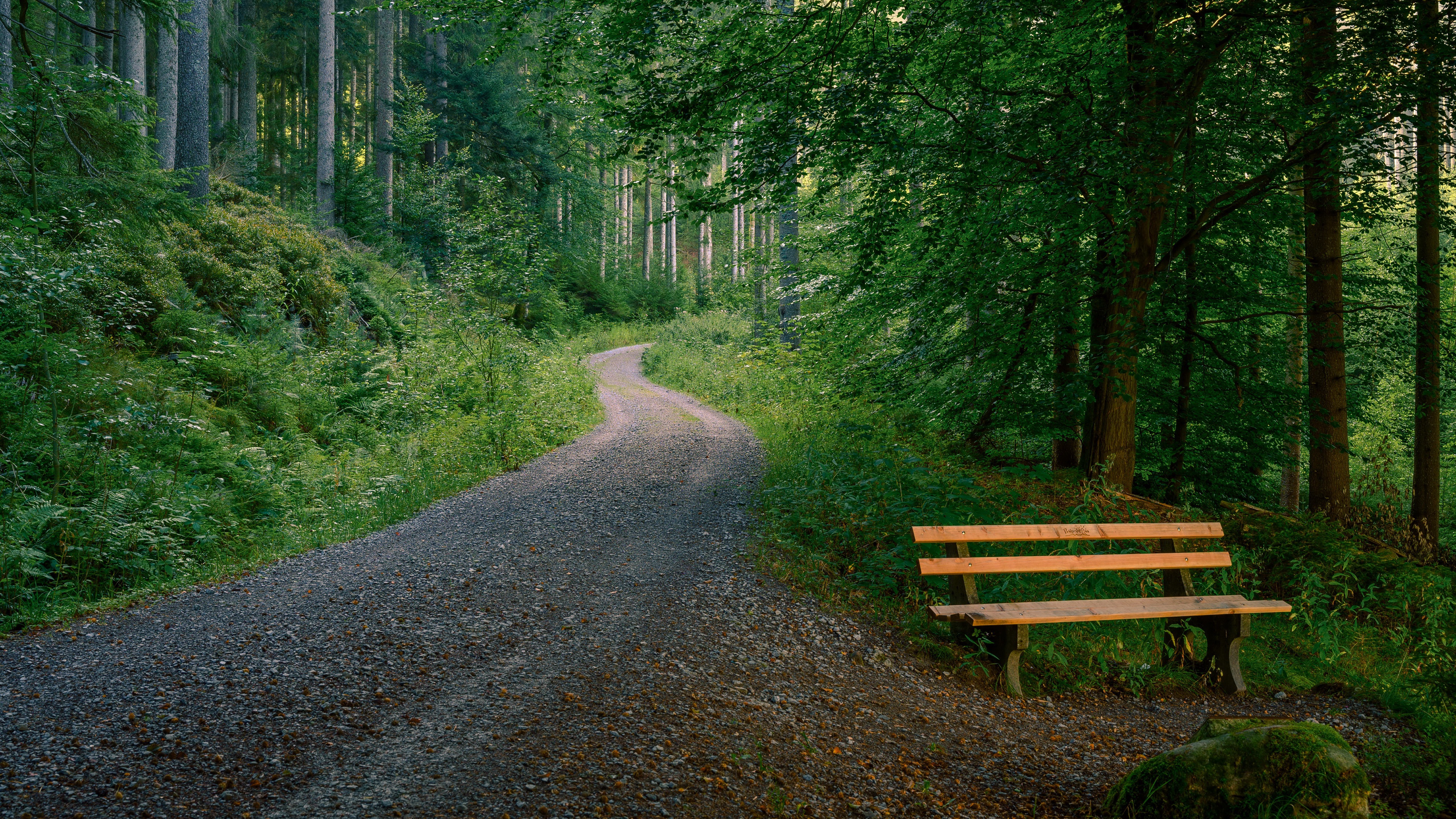Description: A wooden bench sitting on the side of a road in the woods next to a forest road with trees.