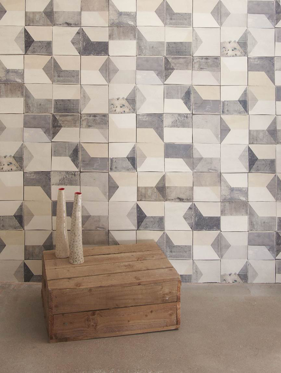 Description: A wooden box with two vases on top of it in front of a wall with a pattern of tiles.