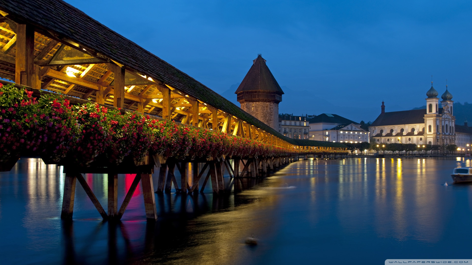 Description: A long wooden bridge with flowers on the side of it and a building in the background at night time.