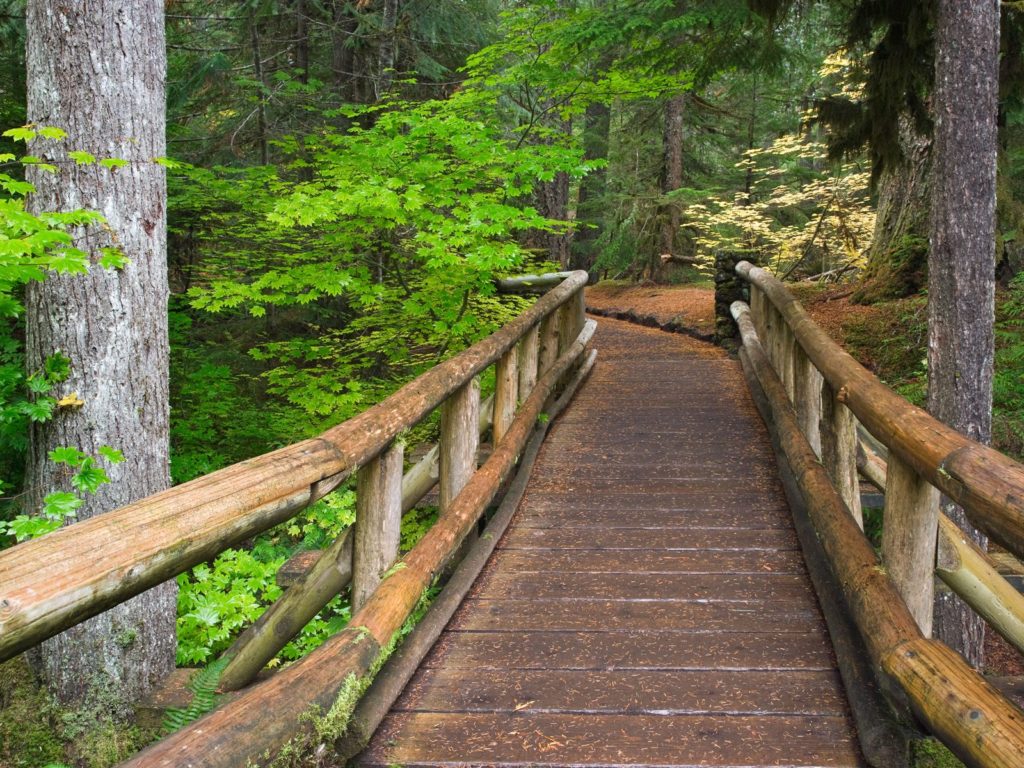 Description: A wooden bridge in a forest with trees and bushes around it and a dog on the bridge looking at the camera.
