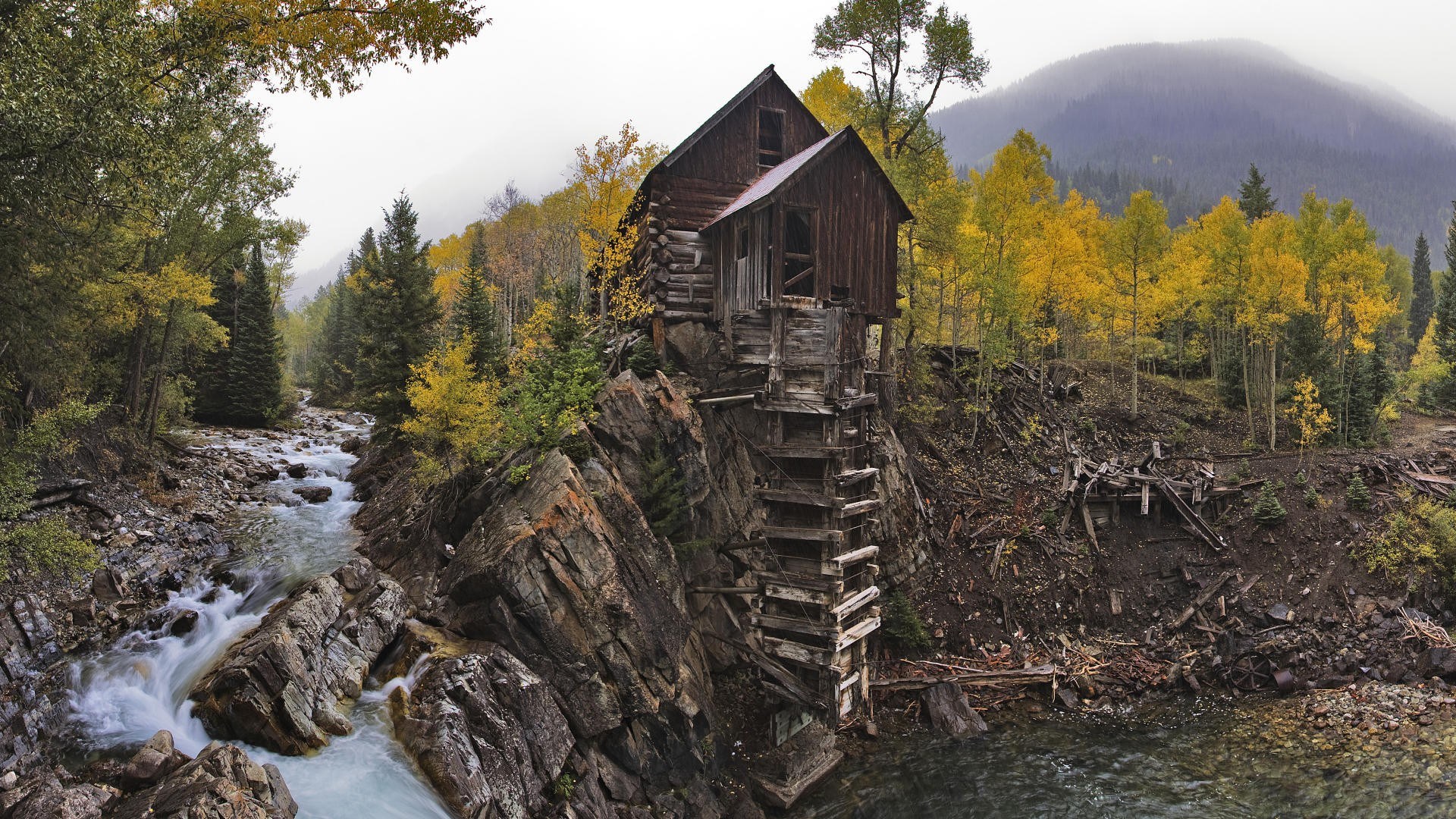 Description: A wooden structure on a cliff next to a river and trees with yellow leaves on them and a mountain in the background.