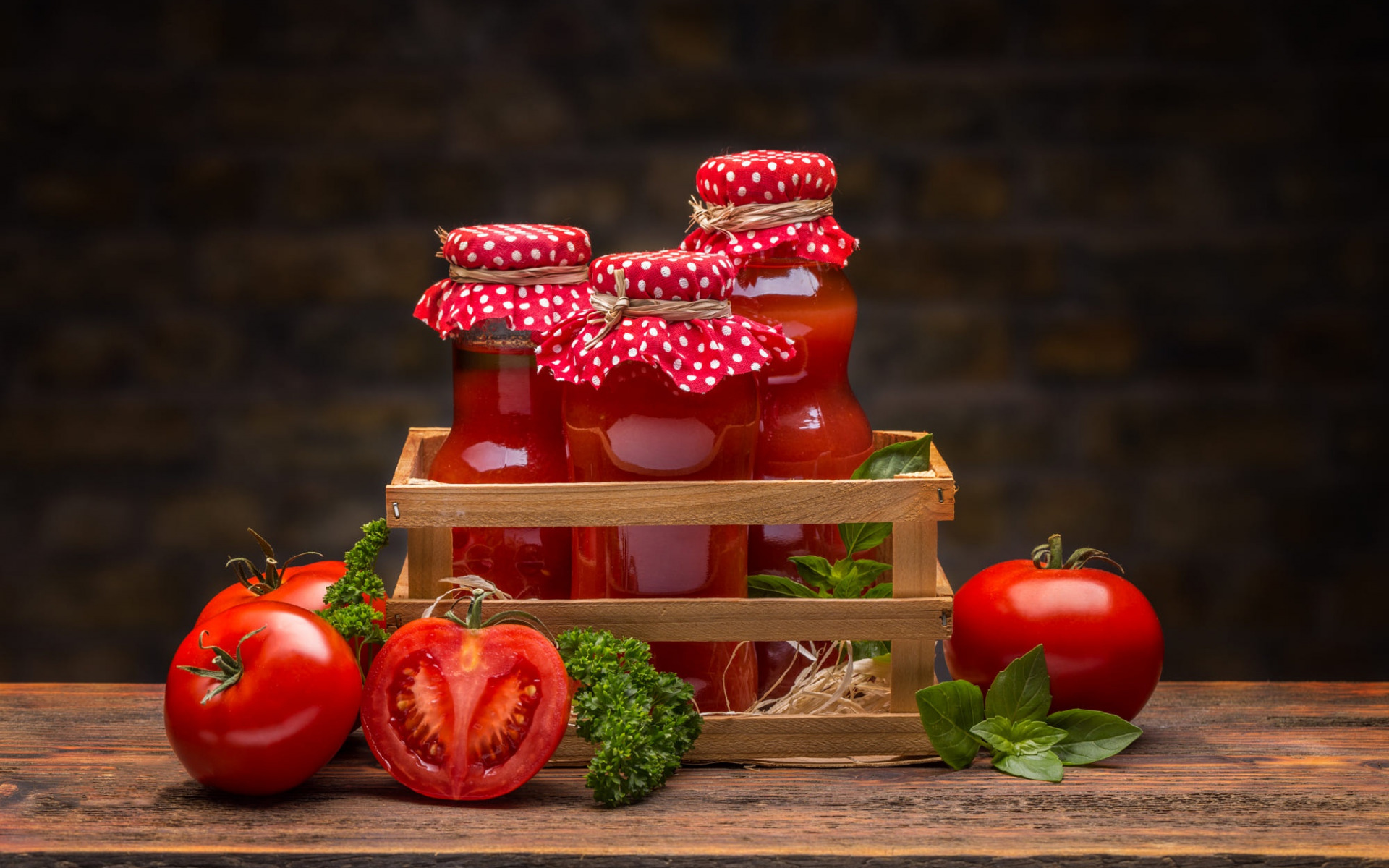 Description: A wooden crate filled with jars of tomato jam next to tomatoes and a couple of tomatoes on a table.