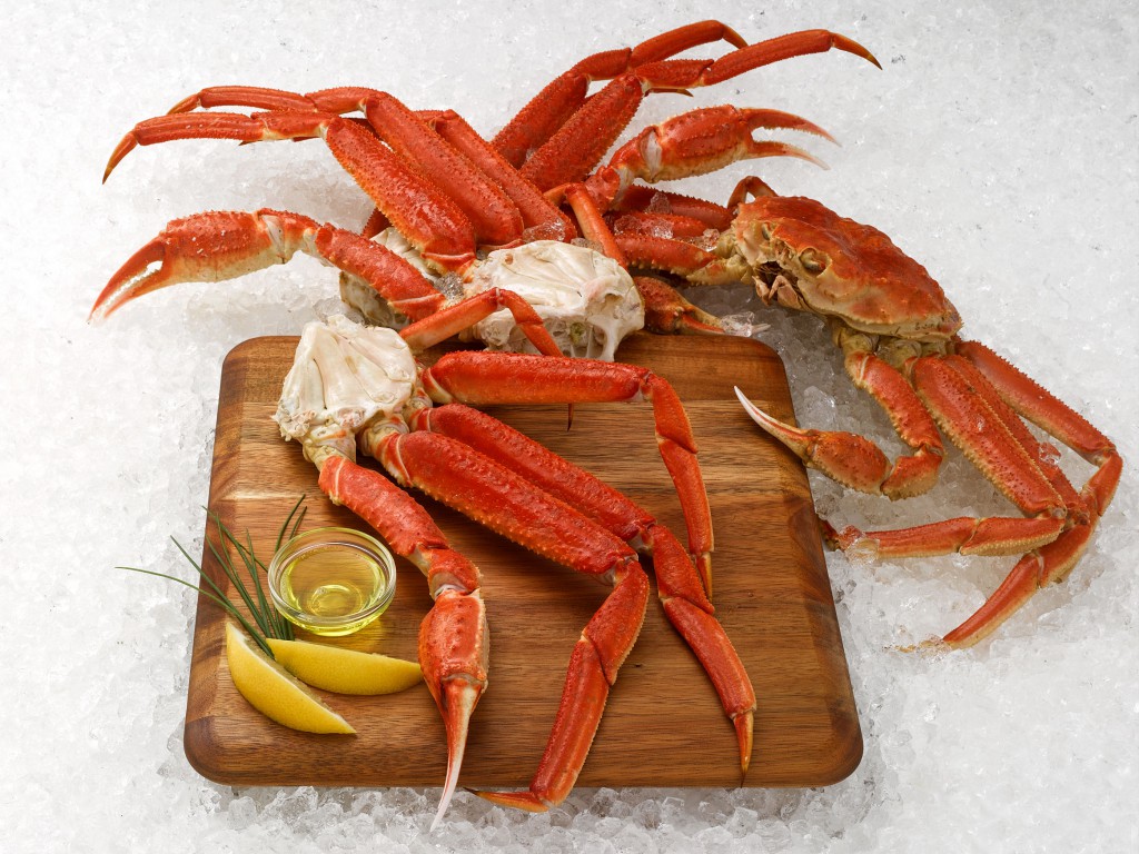 Description: A wooden cutting board topped with a pile of crab legs and a lemon wedge next to it on ice.