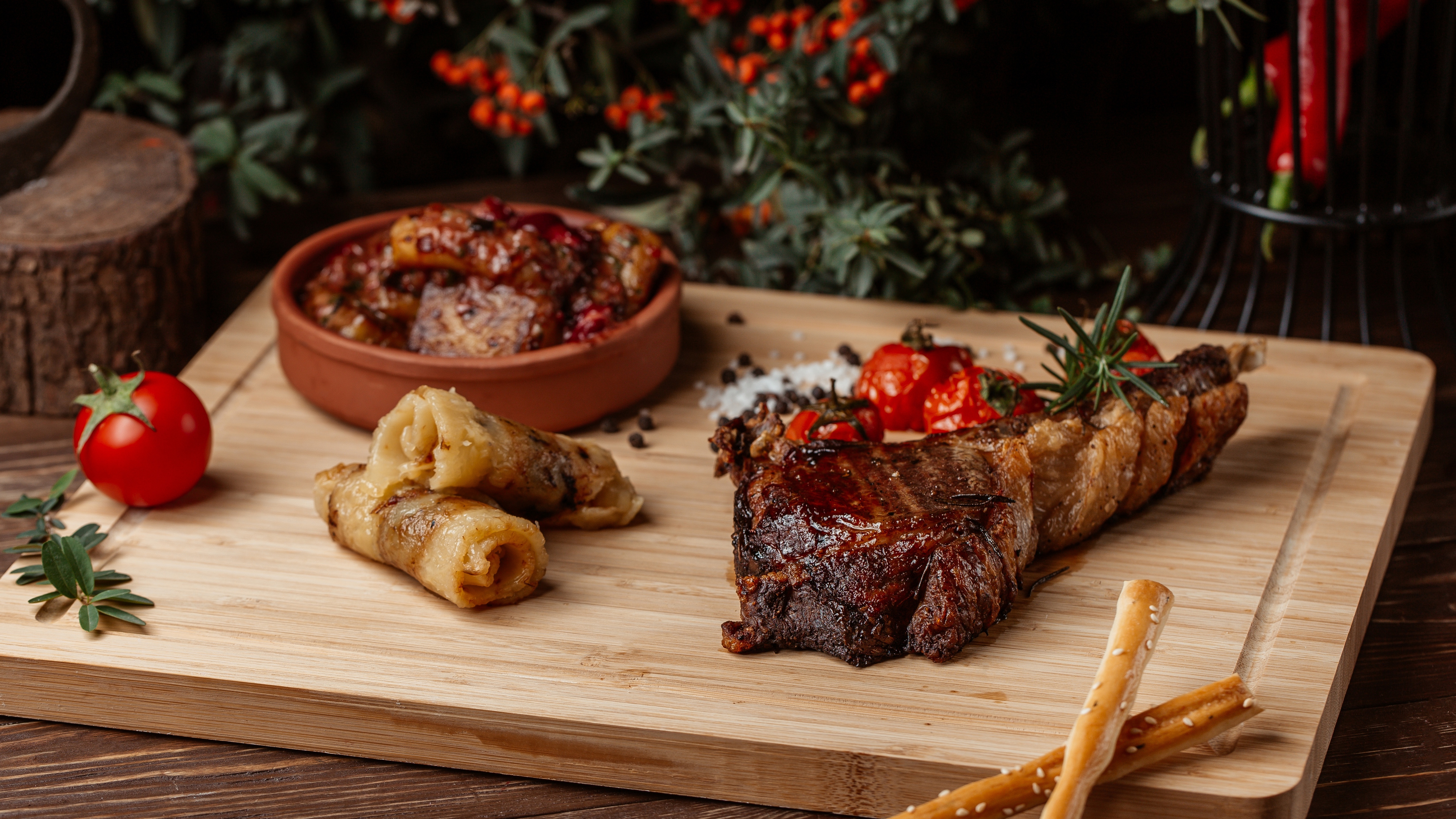 Description: A wooden cutting board topped with meat and vegetables next to a bowl of sauce and a fork and a bowl of tomatoes.
