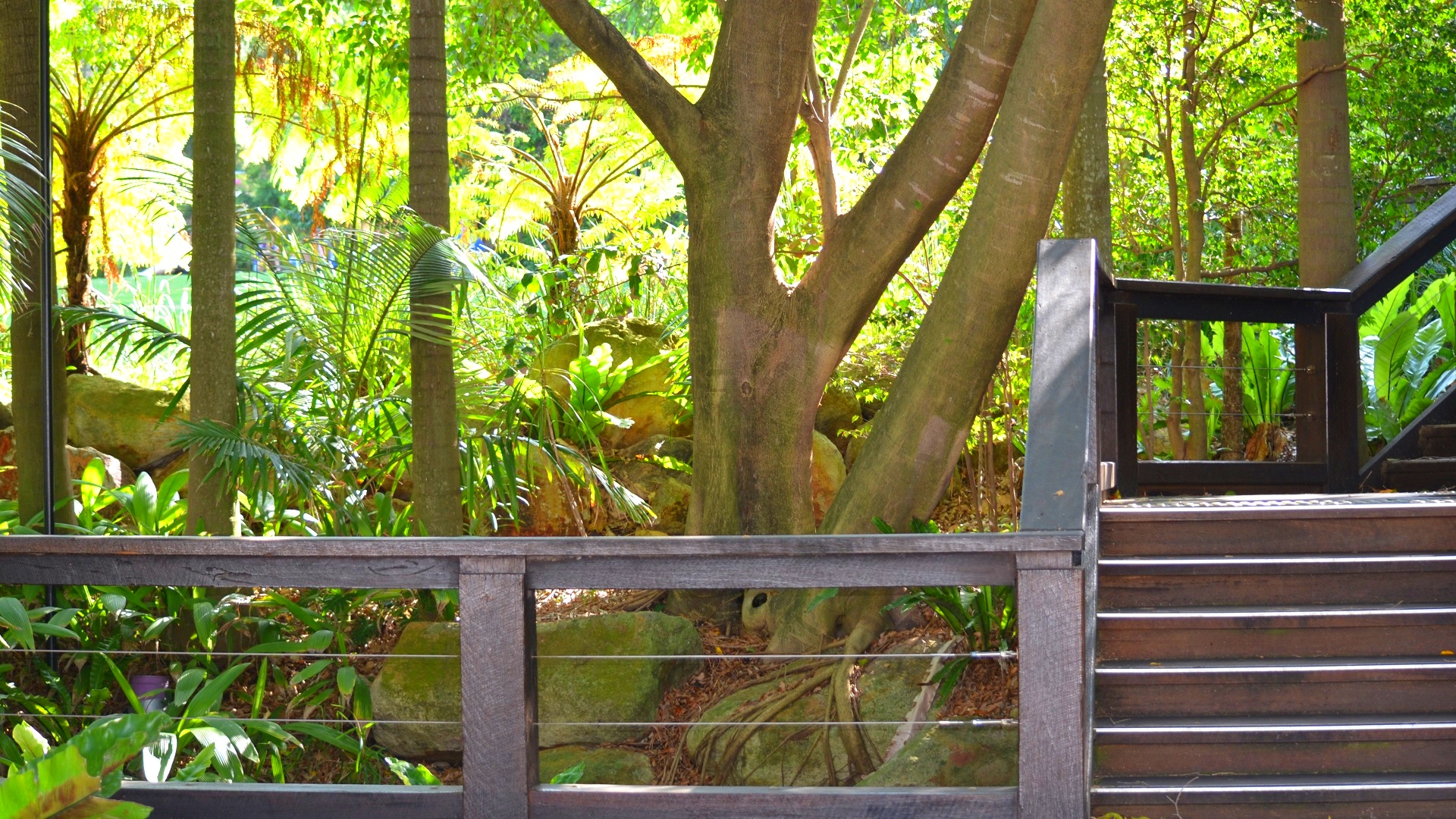 Description: A wooden deck in a tropical forest with trees and plants on either side of it and a staircase leading up to the top of the deck.