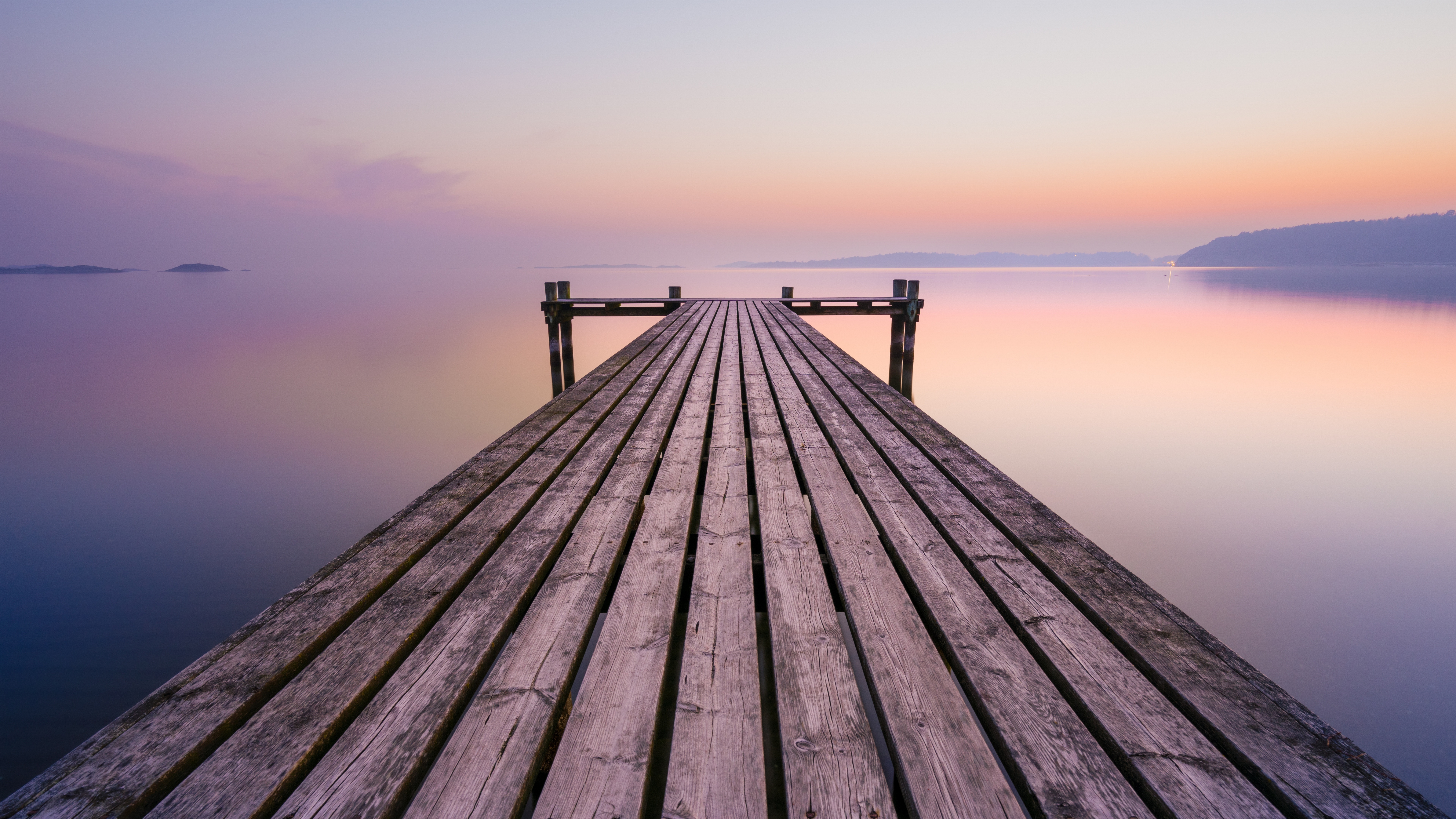 Description: A wooden dock with a bench on it in the water at sunset or dawn with a pink sky and a body of water in the background.