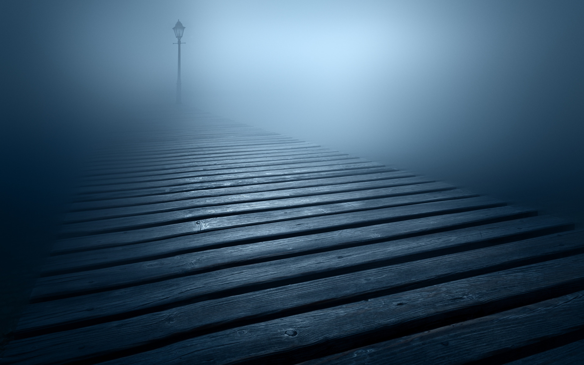 Description: A wooden dock with a light on top of it in the foggy night time with a street lamp.