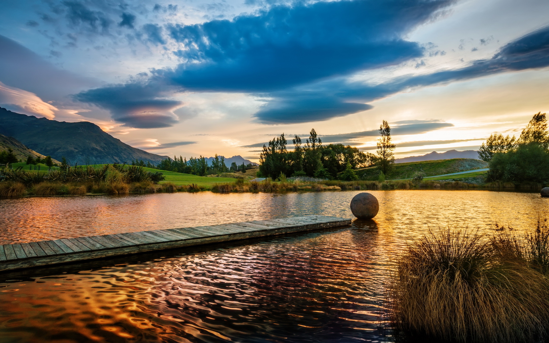 Description: A wooden dock sitting on top of a lake next to a lush green hillside under a cloudy sky with a sunset.