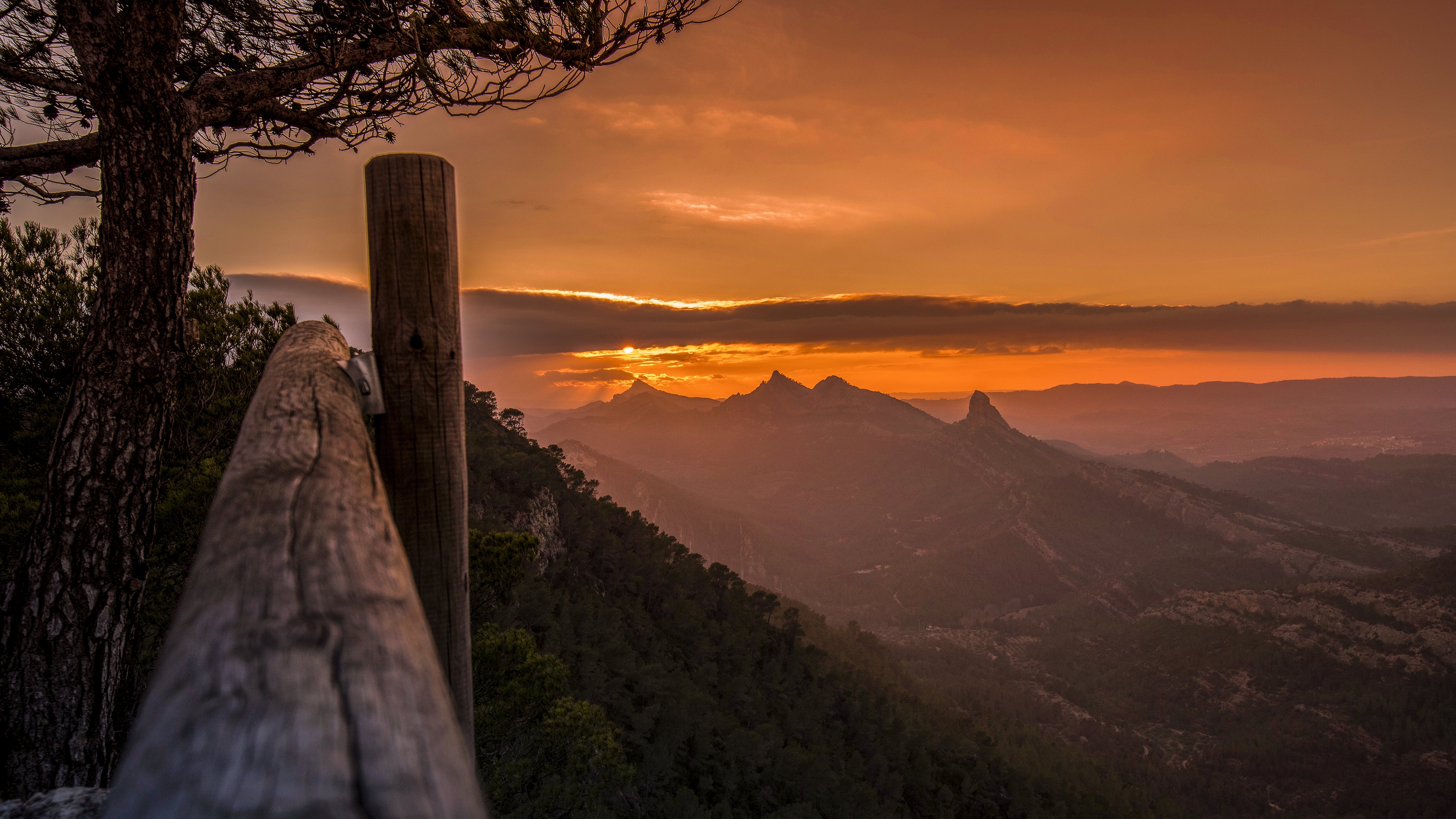Description: A wooden fence on a mountain with a sunset in the background and mountains in the distance with trees and bushes.
