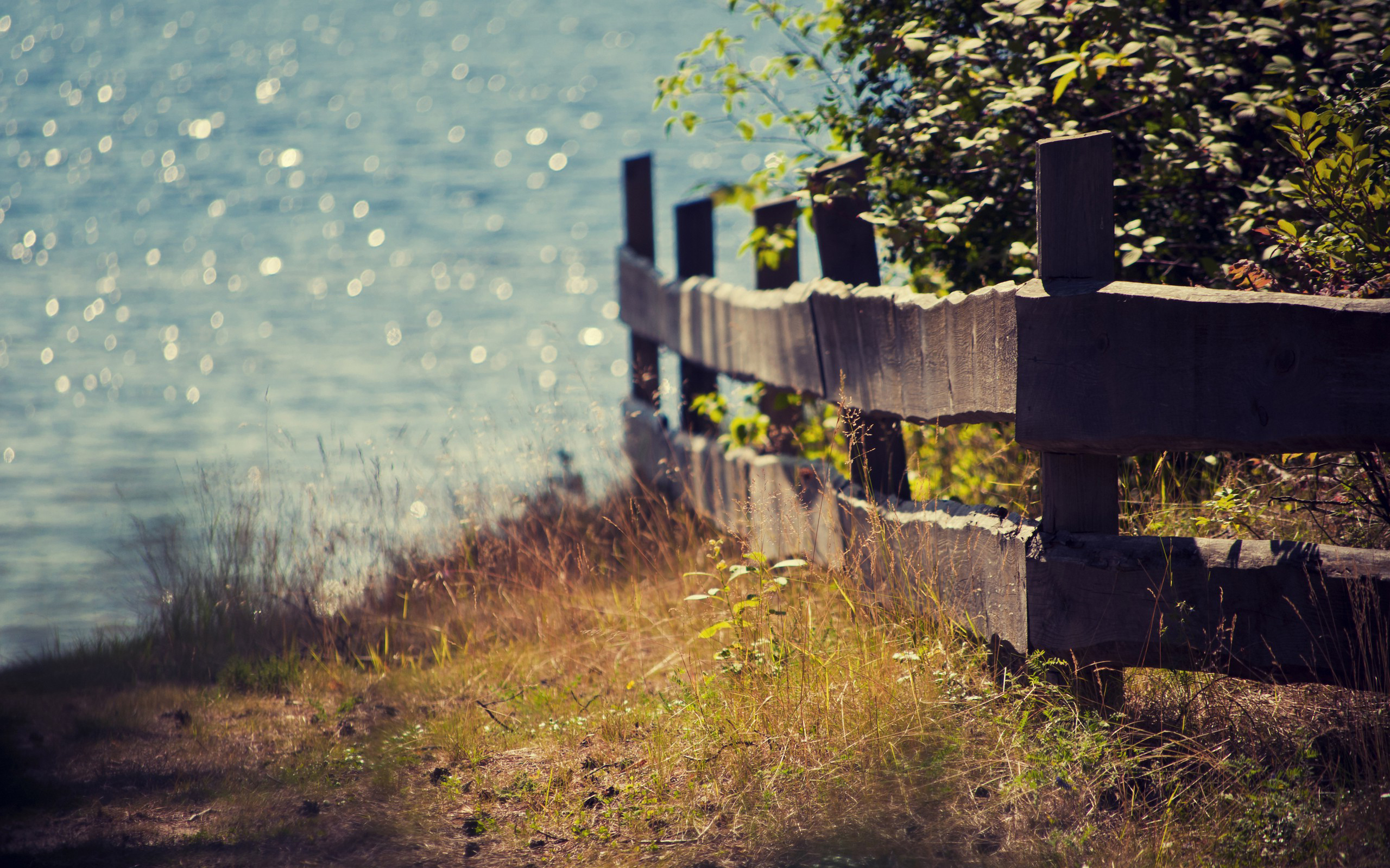 Description: A wooden fence near a body of water with a tree in the background and grass in the foreground.