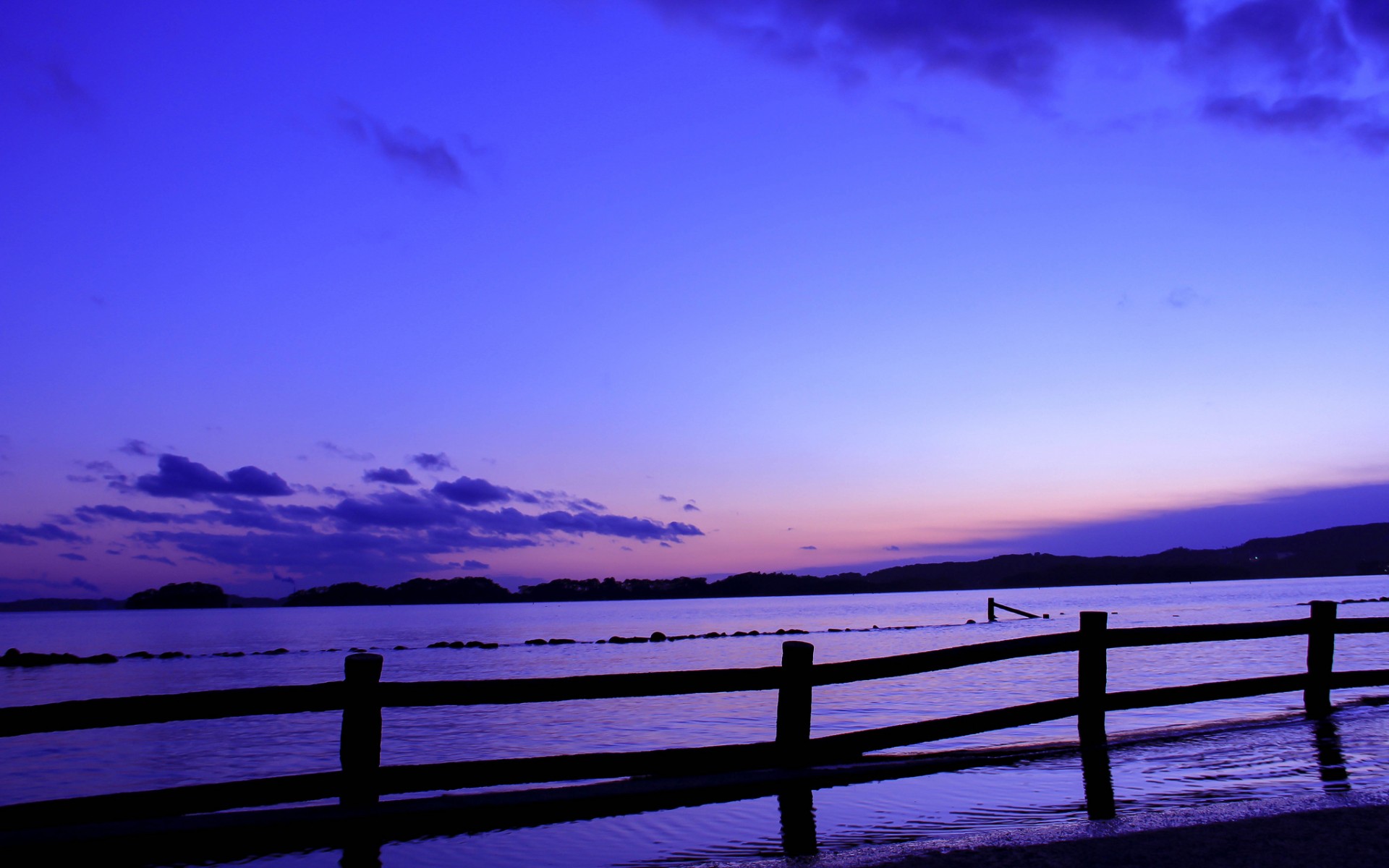 Description: A wooden fence is next to the water at sunset or dawn with a purple sky in the background and a body of water in the foreground.