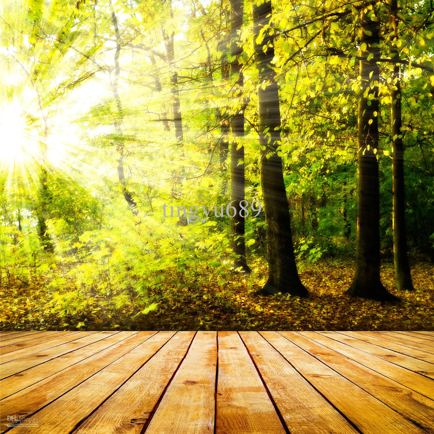 Description: A wooden floor with a bright sun shining through the trees in the background and a wood floor with a wooden floor.