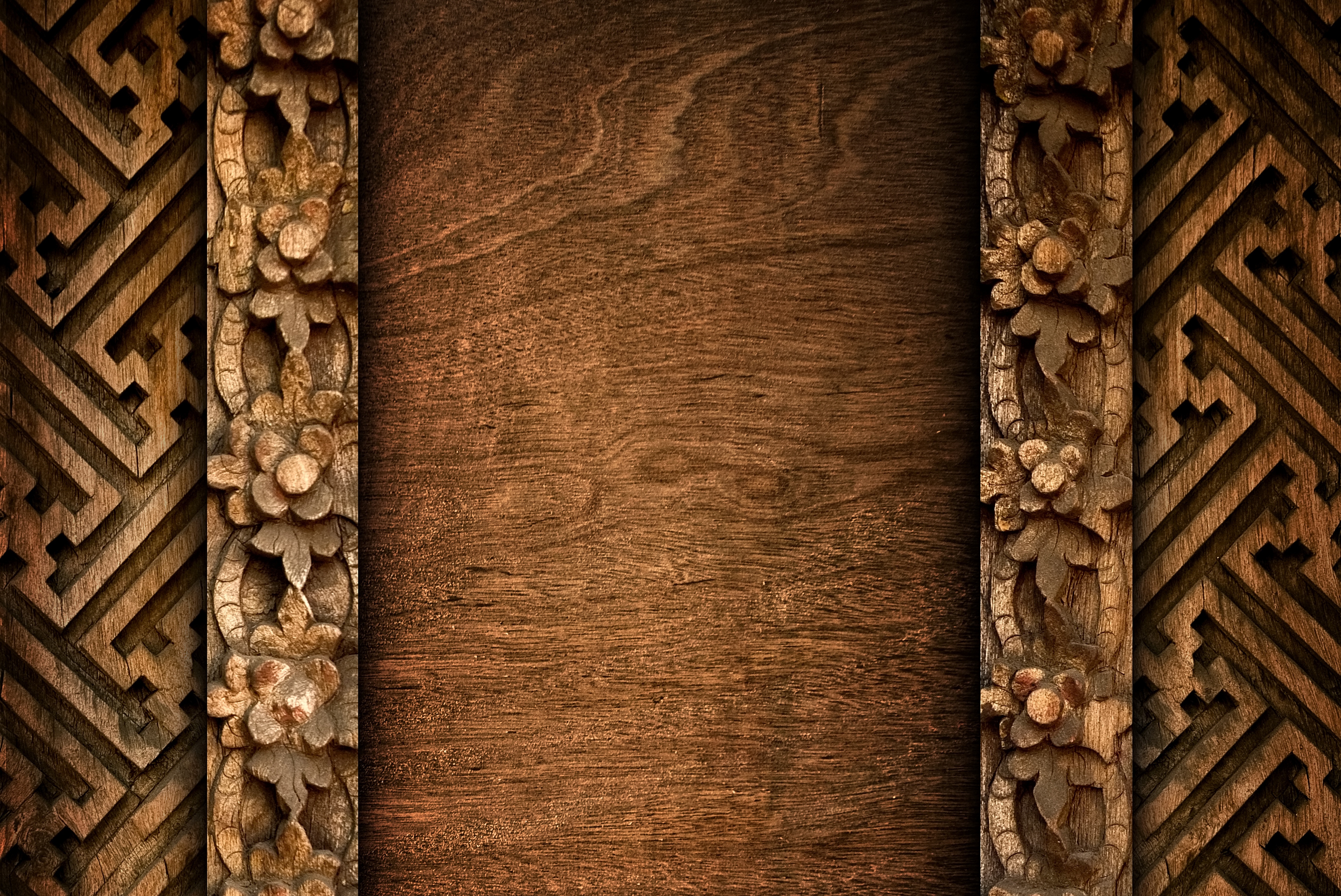 Description: A wooden frame with a carved design on it's sides and a wooden background with a pattern of flowers.