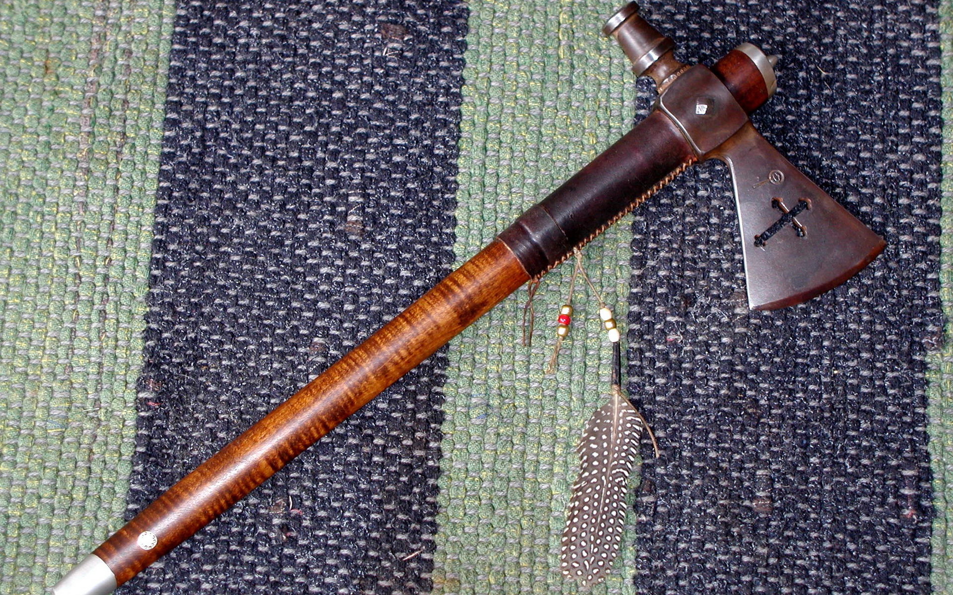 Description: A wooden pipe with a metal tip and a feather on a rug with a feather quill on it.