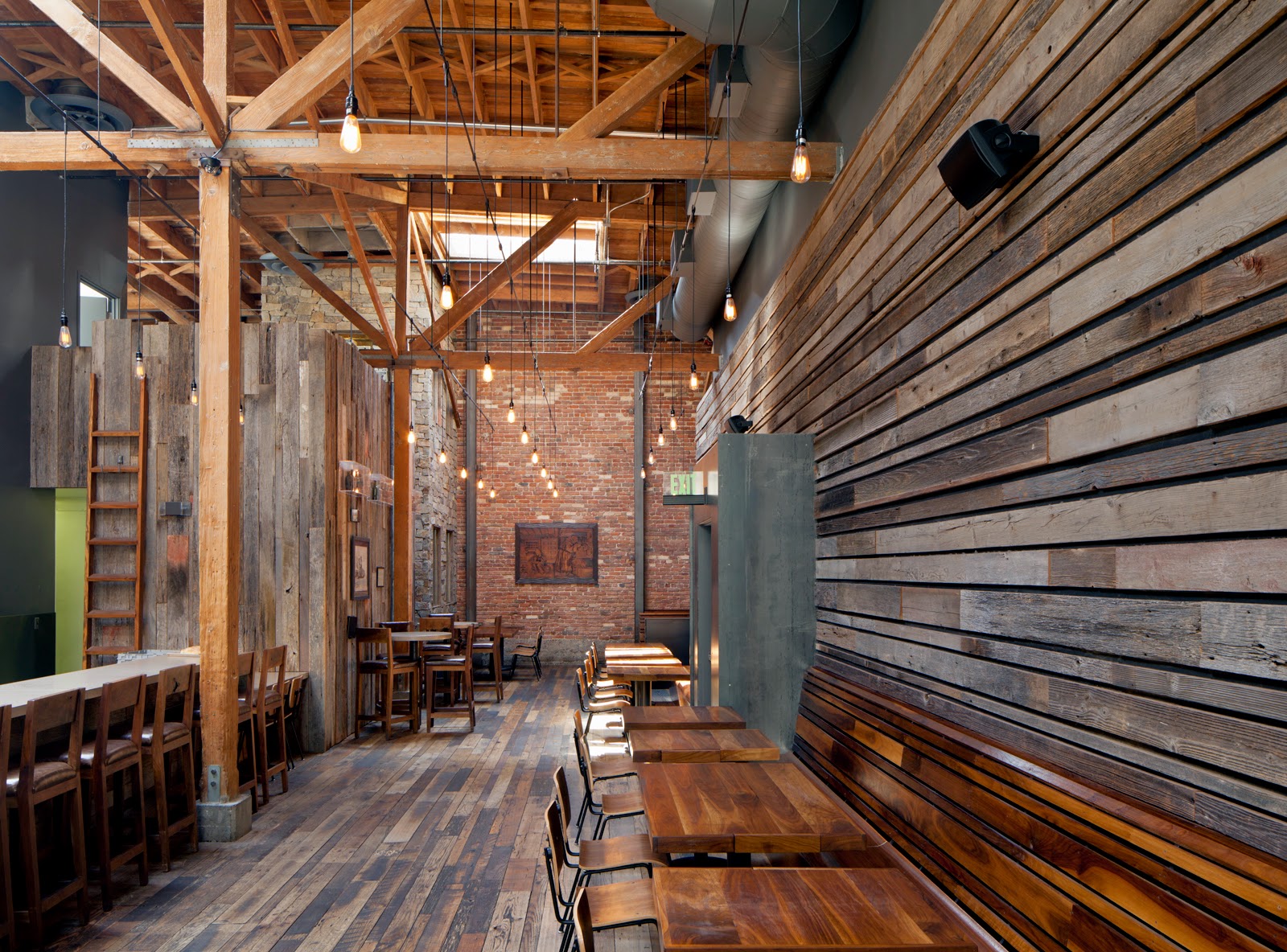 Description: A wooden room with benches and tables inside of it and a ladder to the ceiling above it and a ladder to the ceiling above it.