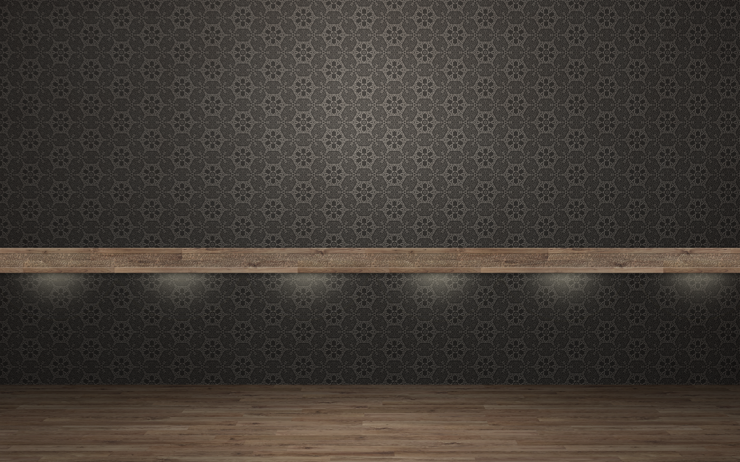 Description: A wooden shelf with lights on it in a room with a wallpaper pattern and a wooden floor in the foreground.
