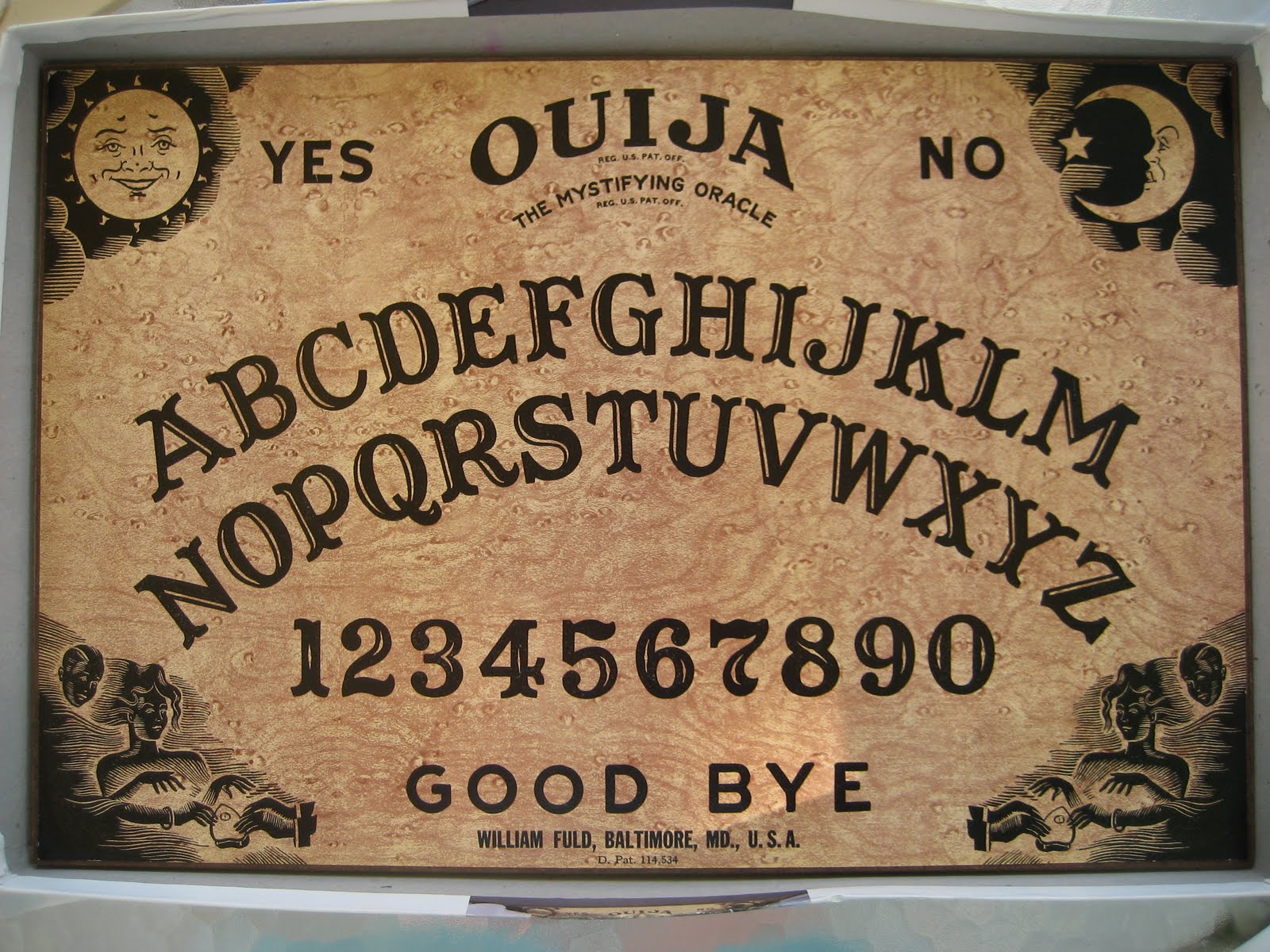 Description: A wooden sign with a black and white design on it's side and a black and white design on the front.